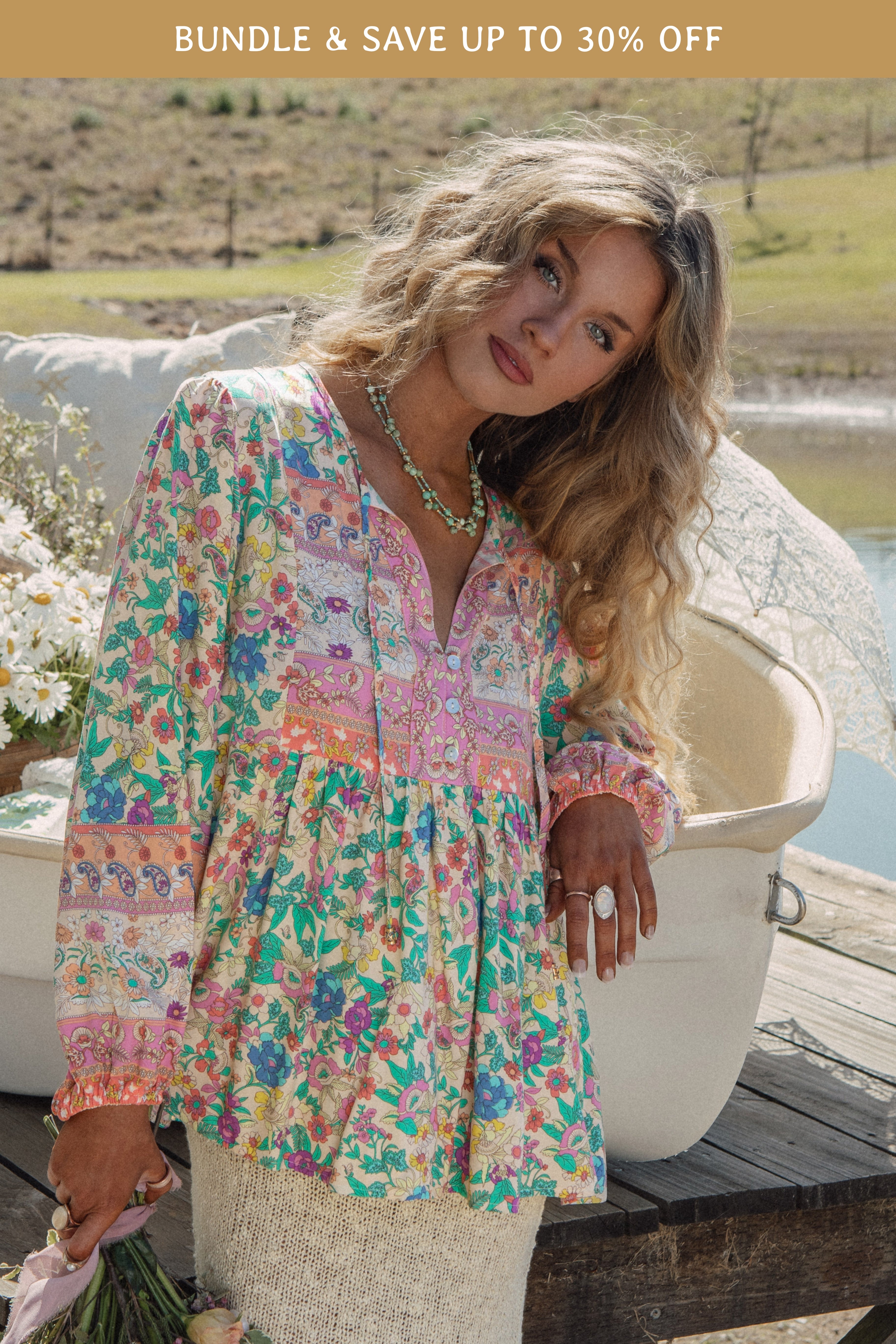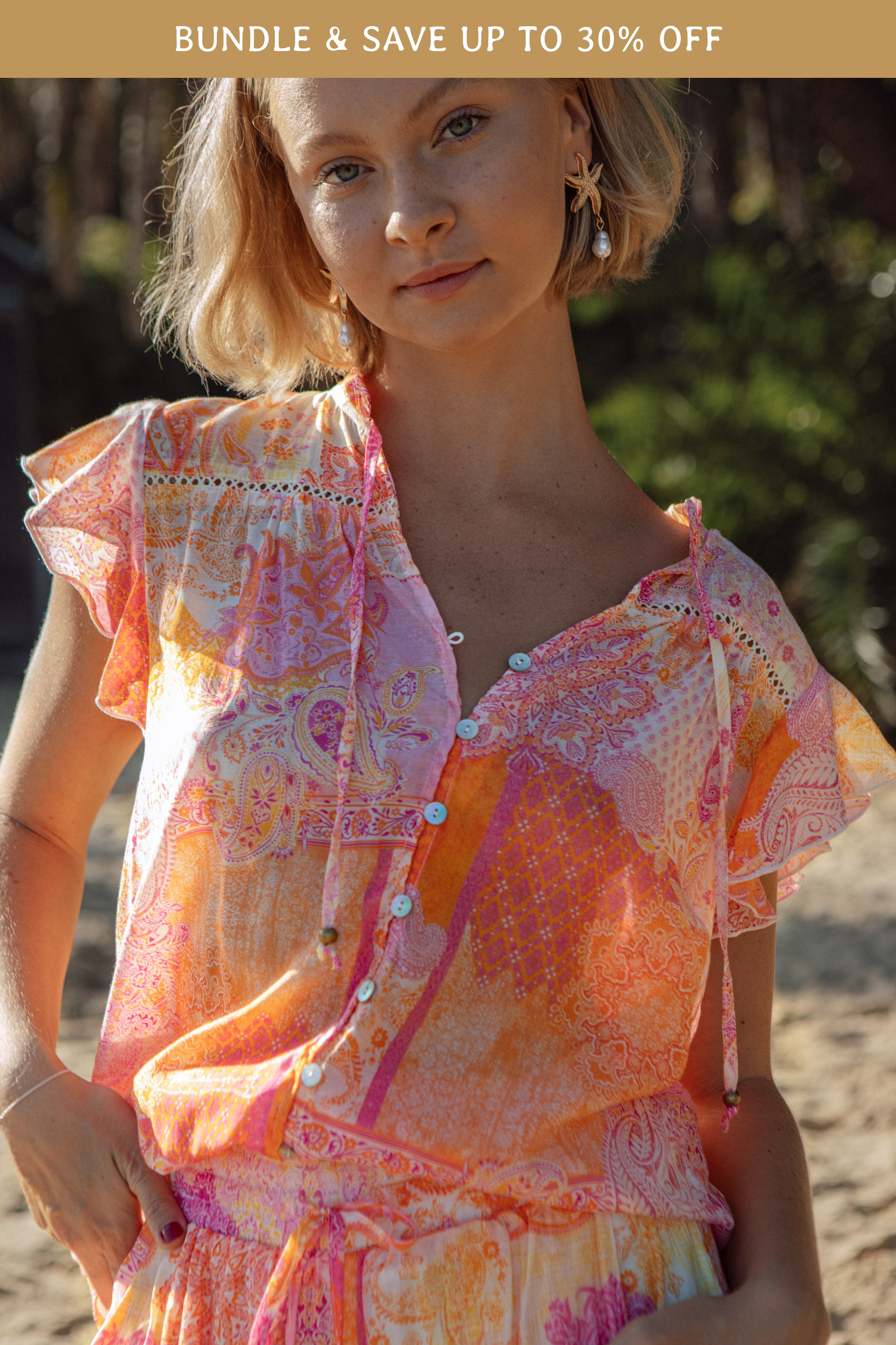 Blossom Blouse - Papaya short sleeve blouse with Boho inspired pattern in shades of pink orange and yellow
