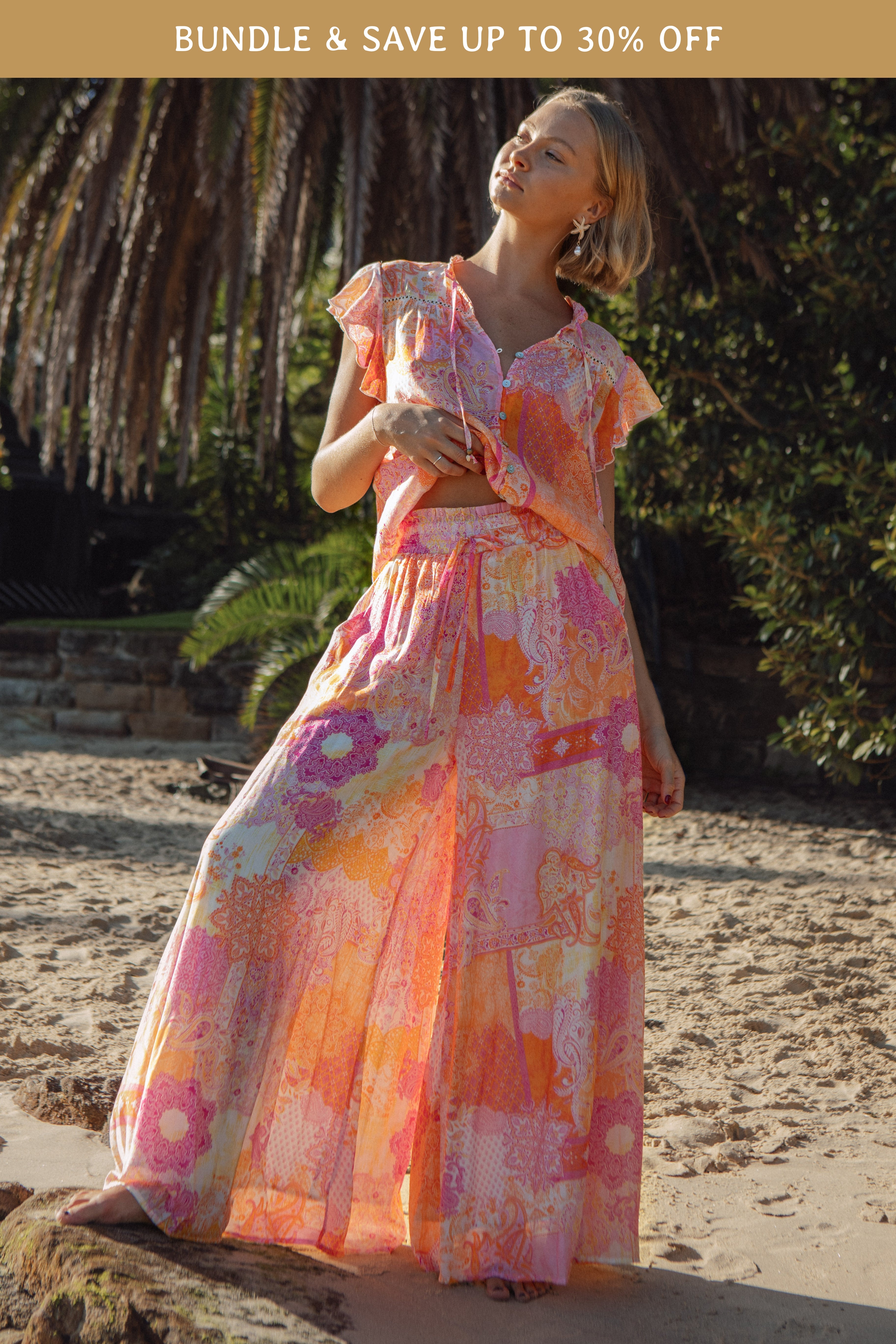 Kaia Maxi Sunburst featuring vibrant orange and yellow boho style pattern