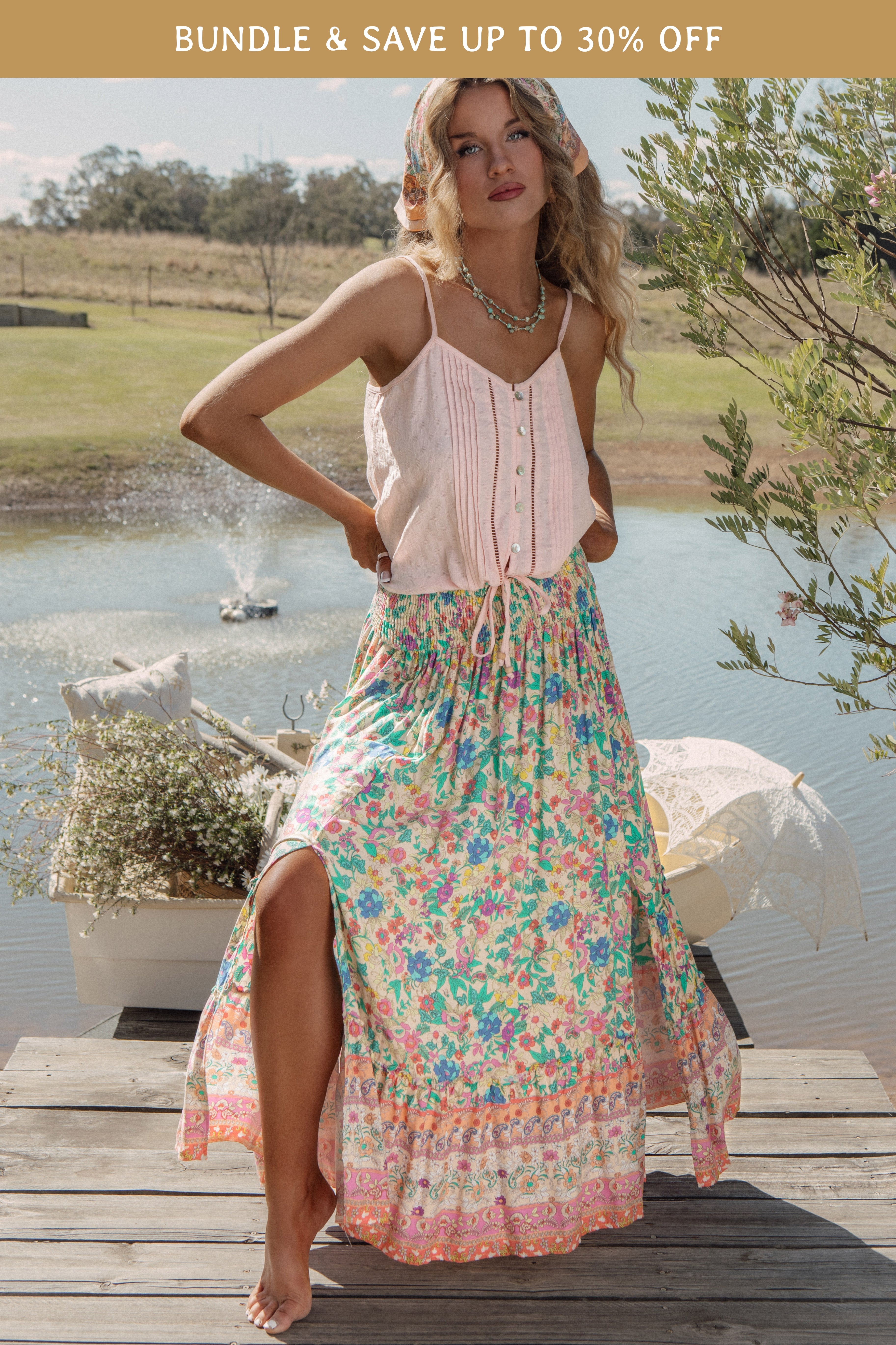 Castaway Cami Waterlily featuring floral inspired Boho print in shades of blue and green