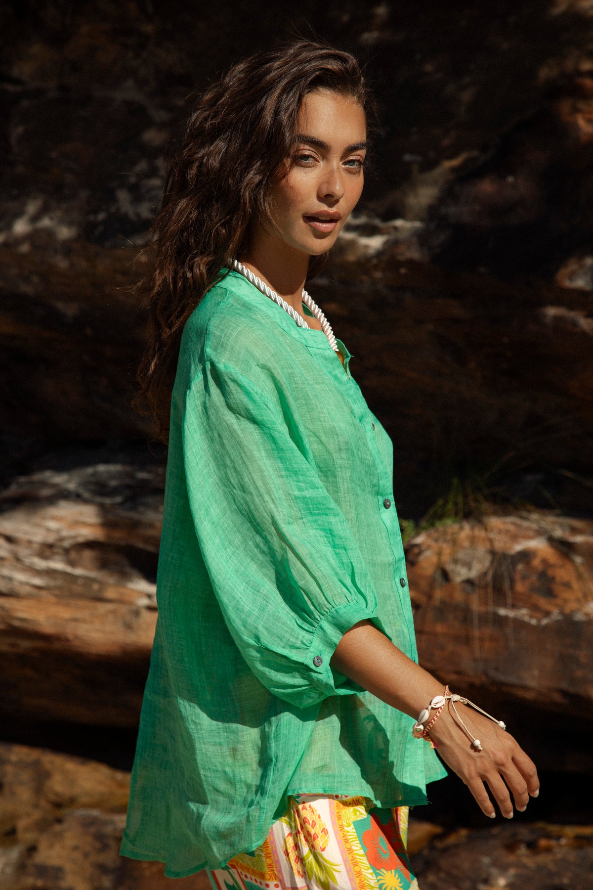 Our Under The Palm Shirt in the most beautiful shade of seafoam green is lightweight and perfect for hot Summer Days in the sun.