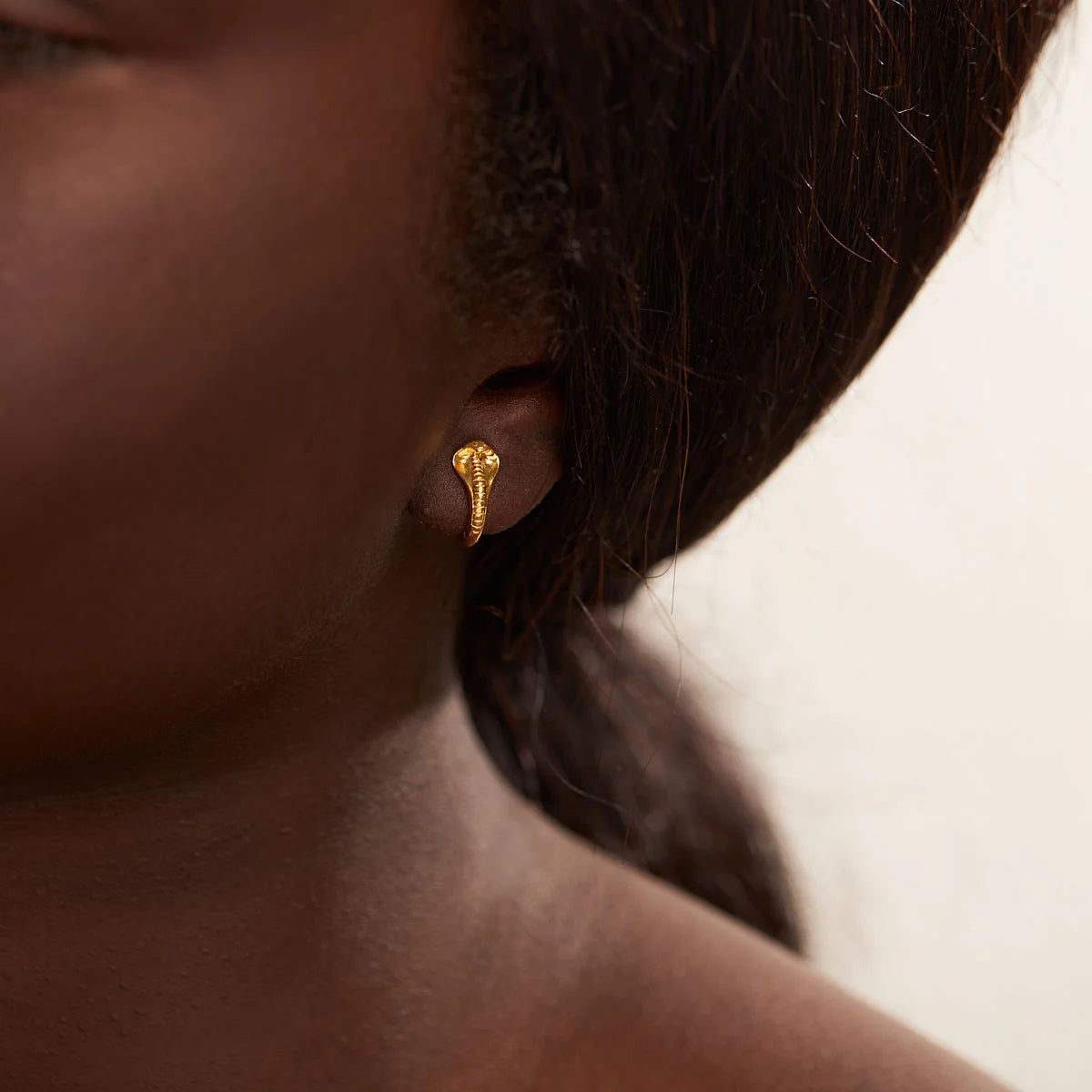 Unleash your inner strength with the Cobra Huggies. Crafted in radiant gold vermeil, these bold hoop earrings feature intricately designed cobra motifs that coil gracefully around your ears.