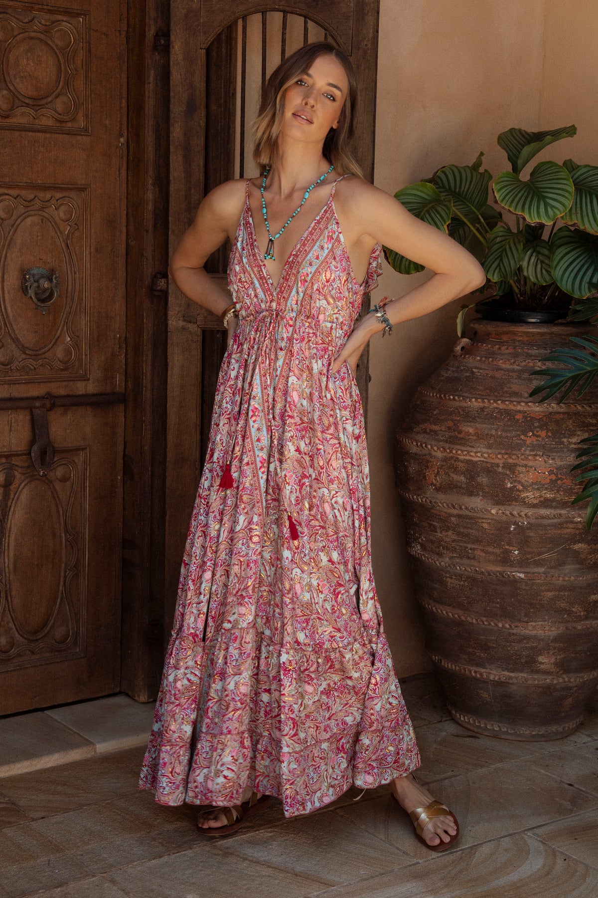 Enya is the dress that captures our hearts every time and conjures our inner Bohemian spirit. This Dress will turn heads all soiree-season with its mesmerising twirl factor and summery 'Rosalita' print. Pair with heels and statement jewels for the ultimate festive look.