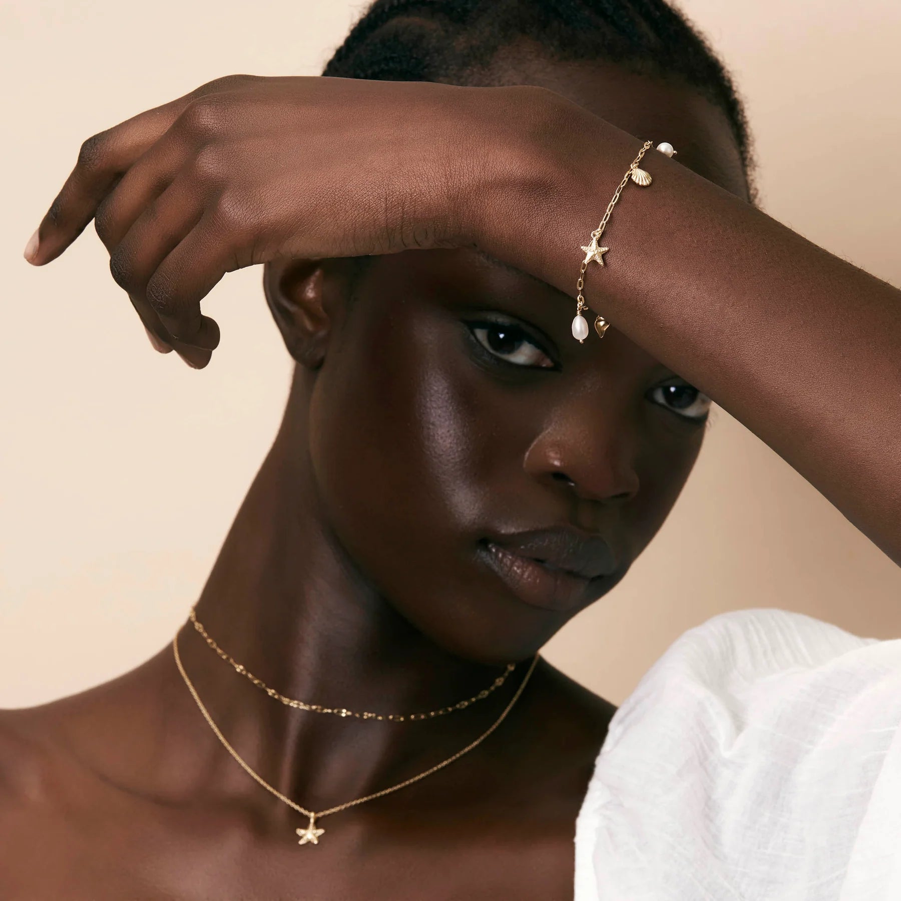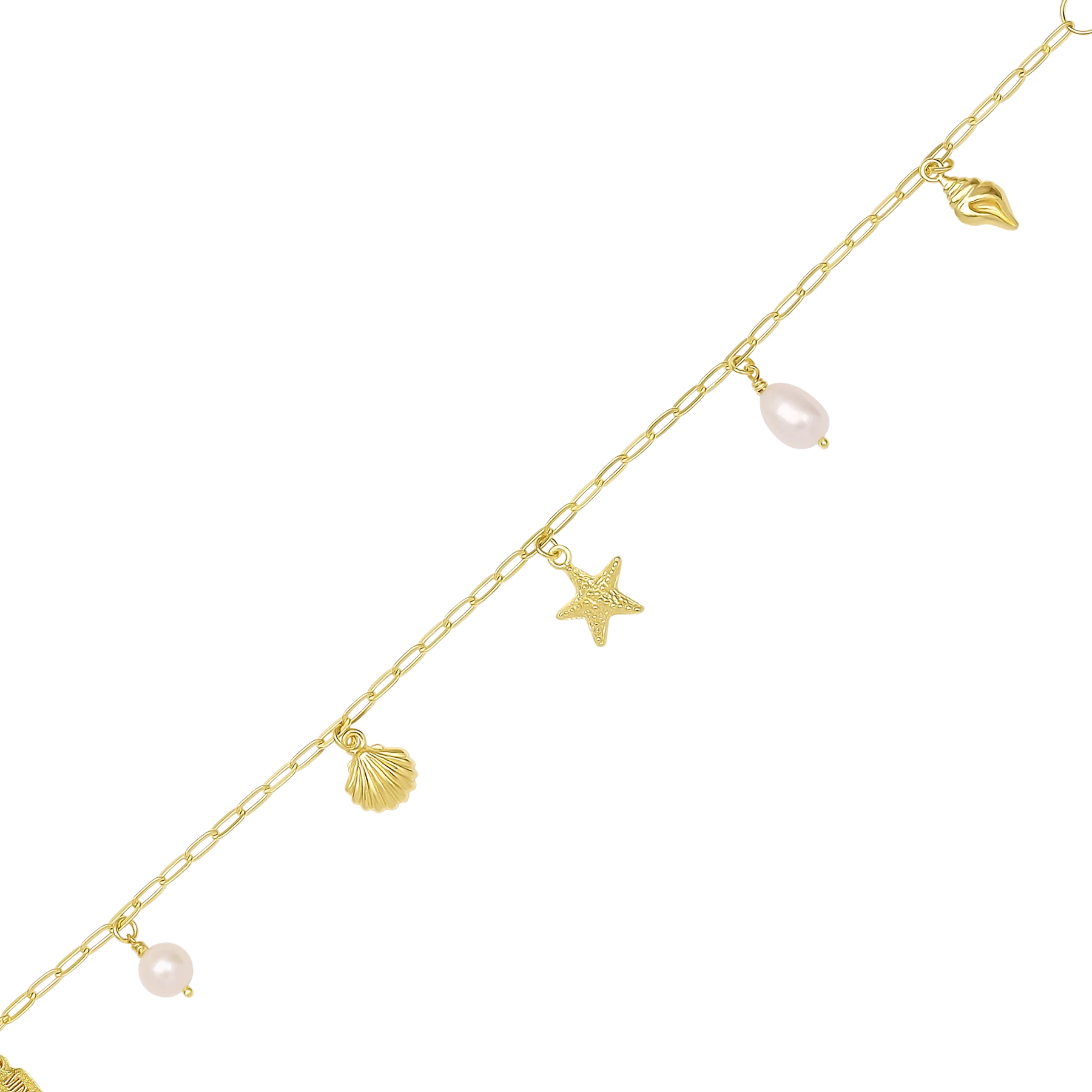 Embody the ethereal spirit of the sea with our Oceanic Pearl Charm Bracelet, intricately crafted in gold vermeil featuring iridescent freshwater pearls.
