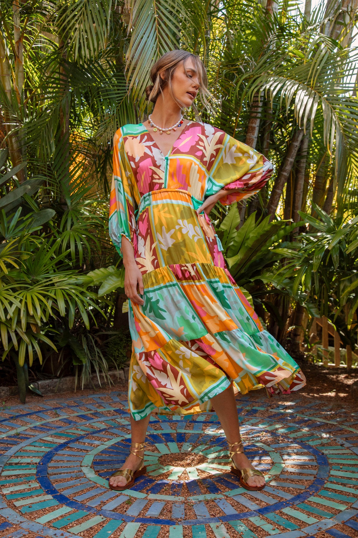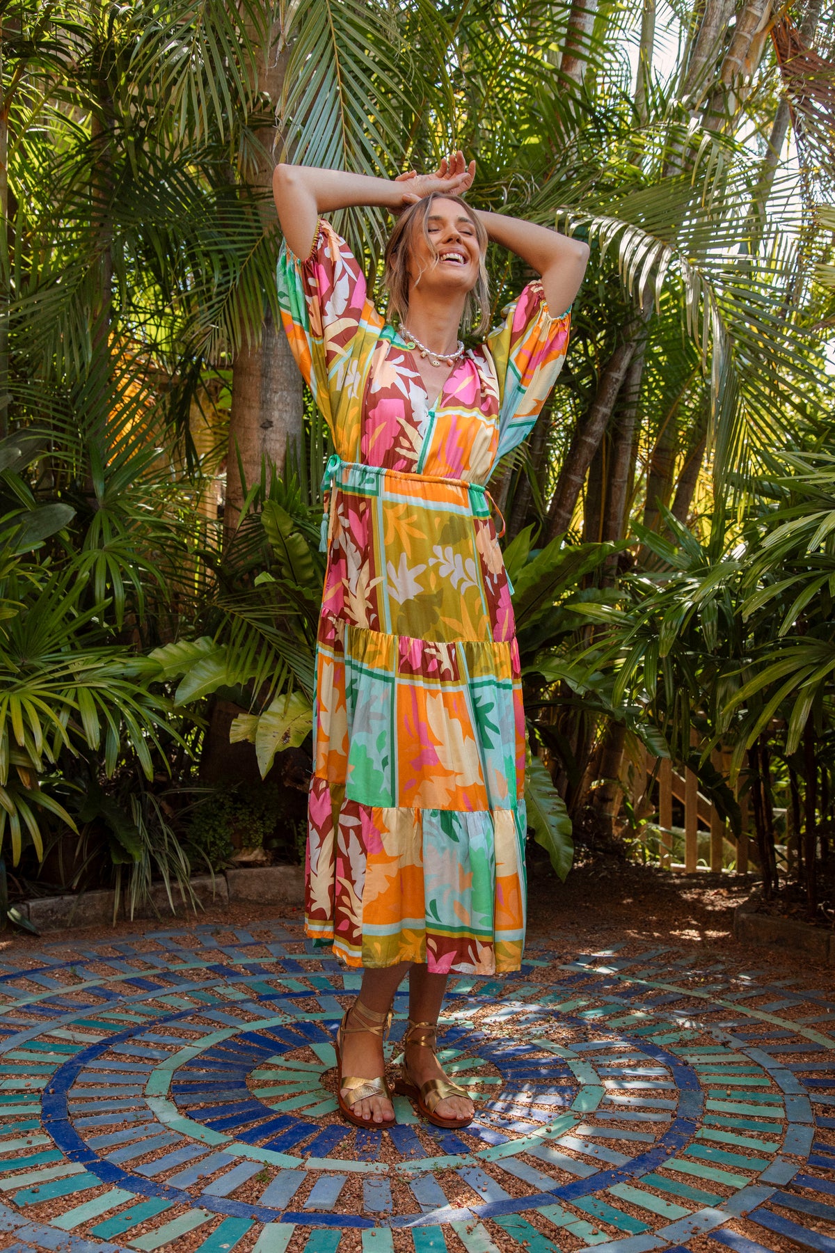 A tropical paradise in this dress! This striking print mixed with all the special details makes our Tropicana Dress a keepsake in your wardrobe!