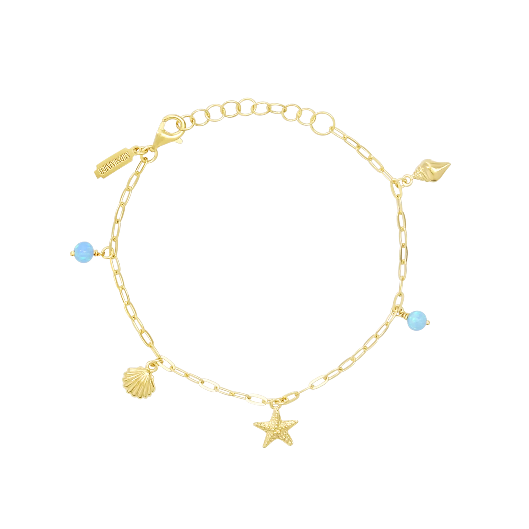 Embody the ethereal spirit of the sea with our Oceanic Opal Charm Bracelet, intricately crafted in gold vermeil featuring iridescent opaline.