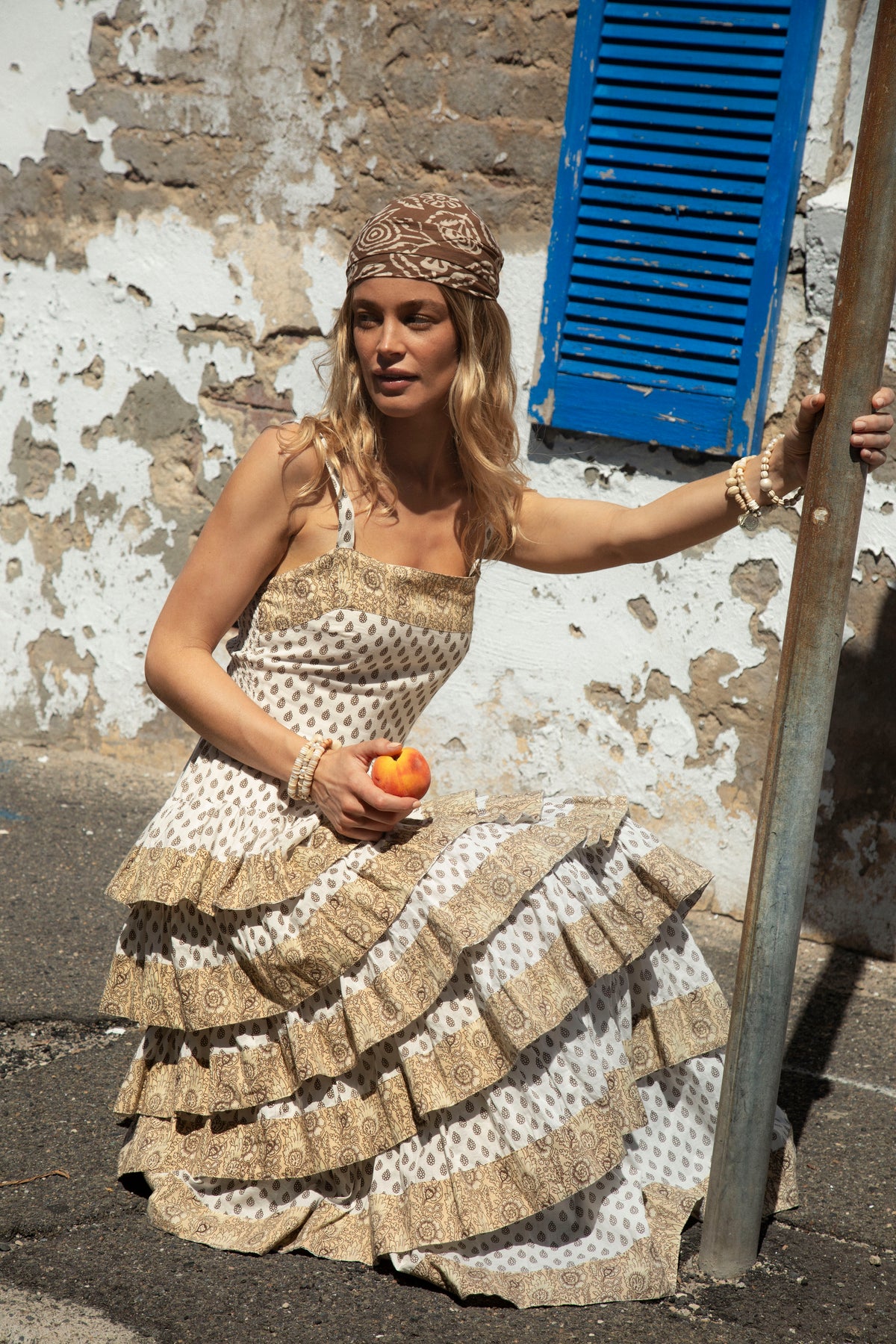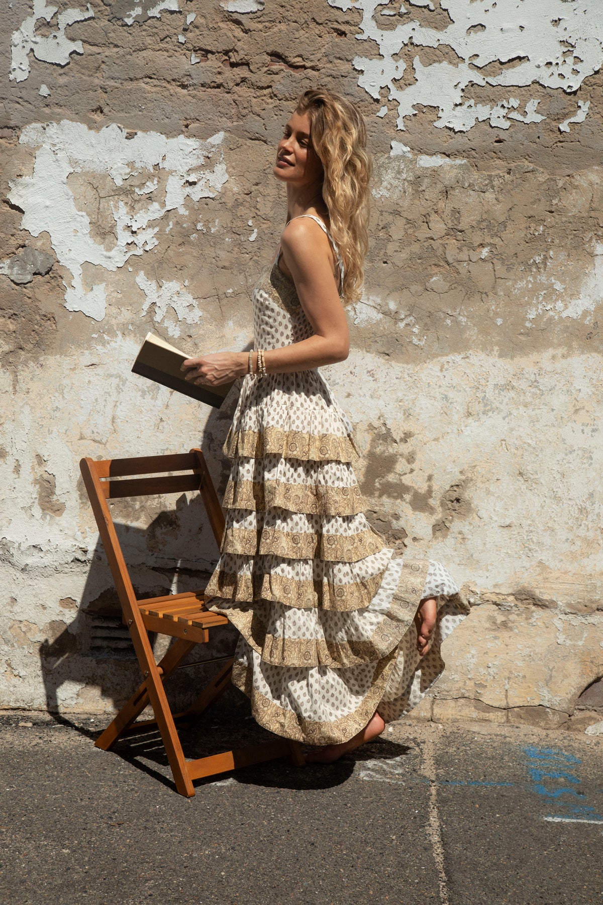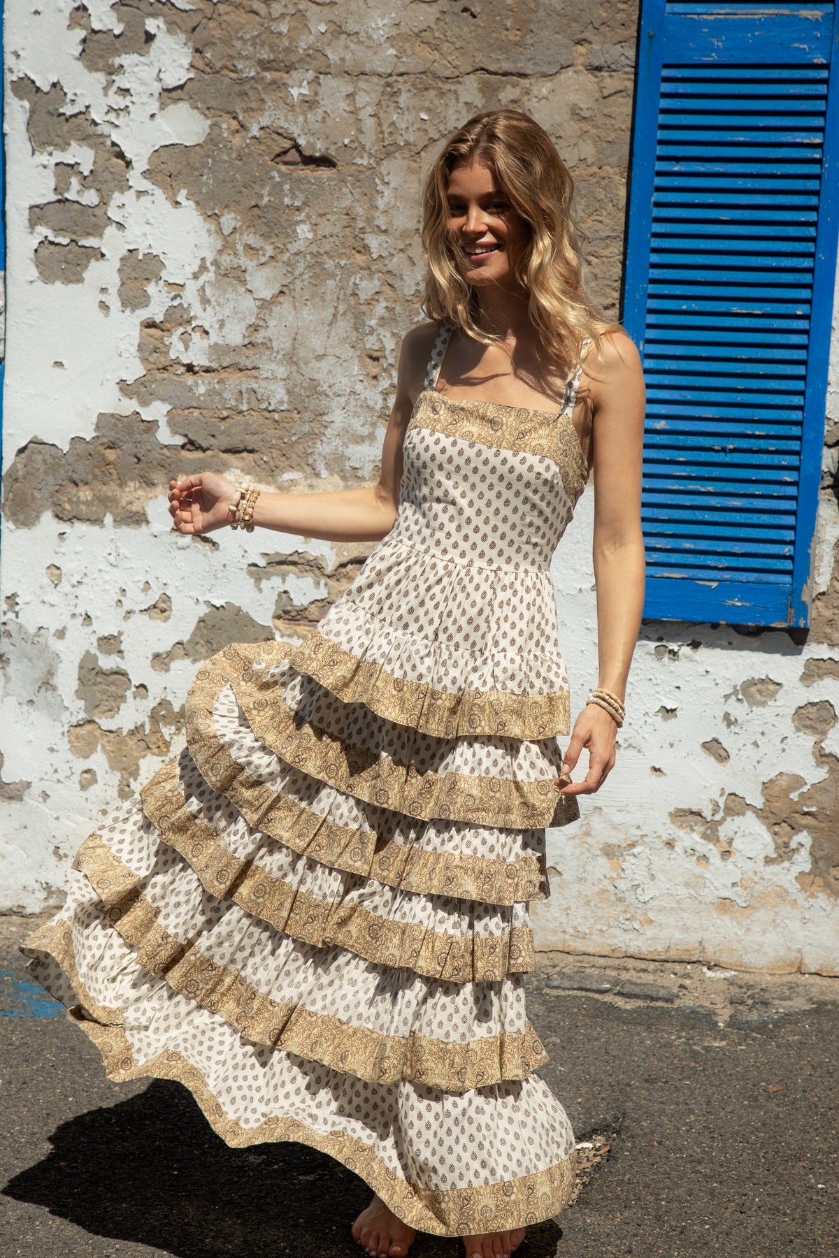A floaty, beach-ready maxi dress in soft cream and warm brown tones with gorgeous ruffle detail. Effortless and coastal, made for sun, sand, and slow summer days, with a tiered silhouette that moves beautifully with every step.