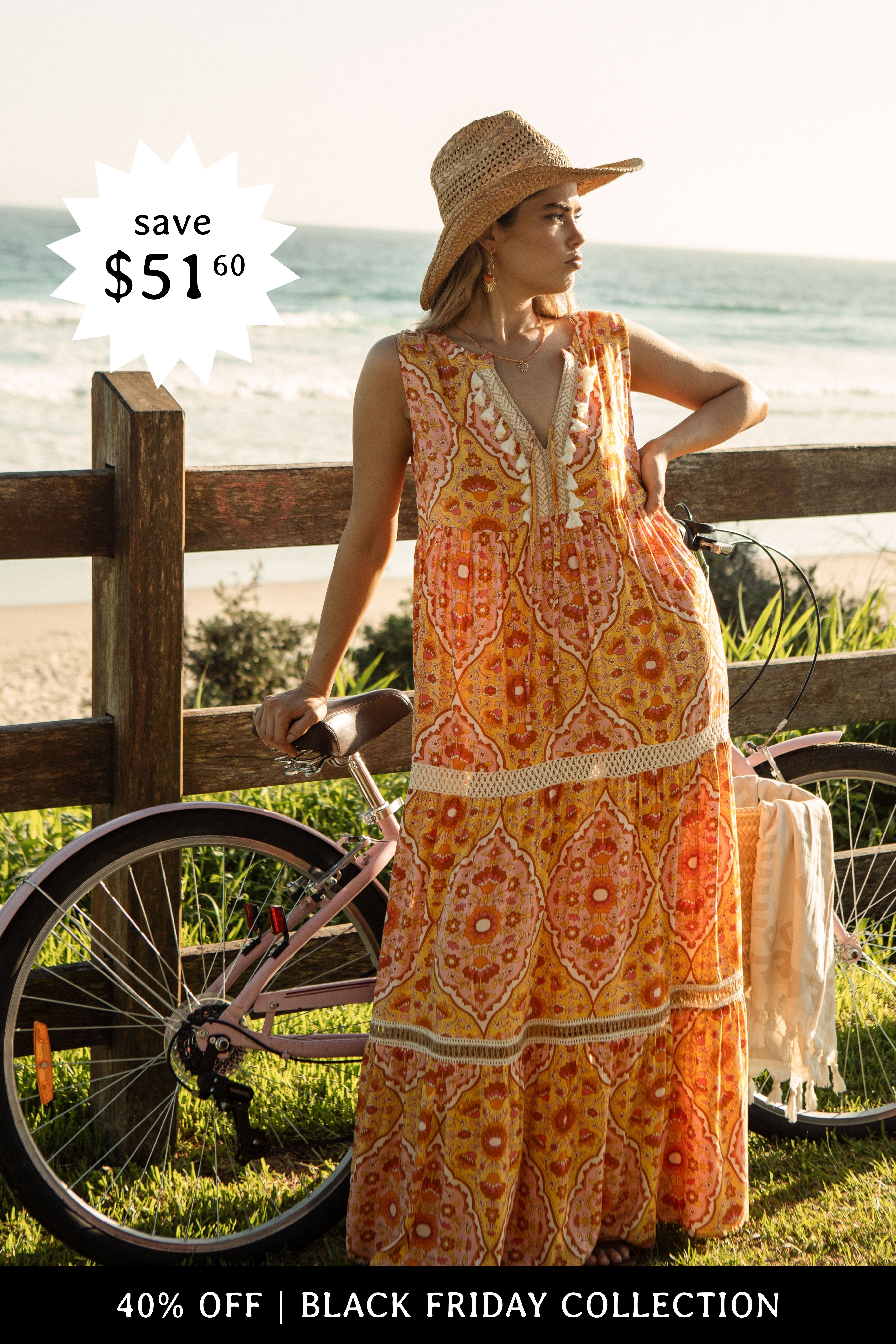 Kaia Maxi Sunburst featuring vibrant orange and yellow boho style pattern