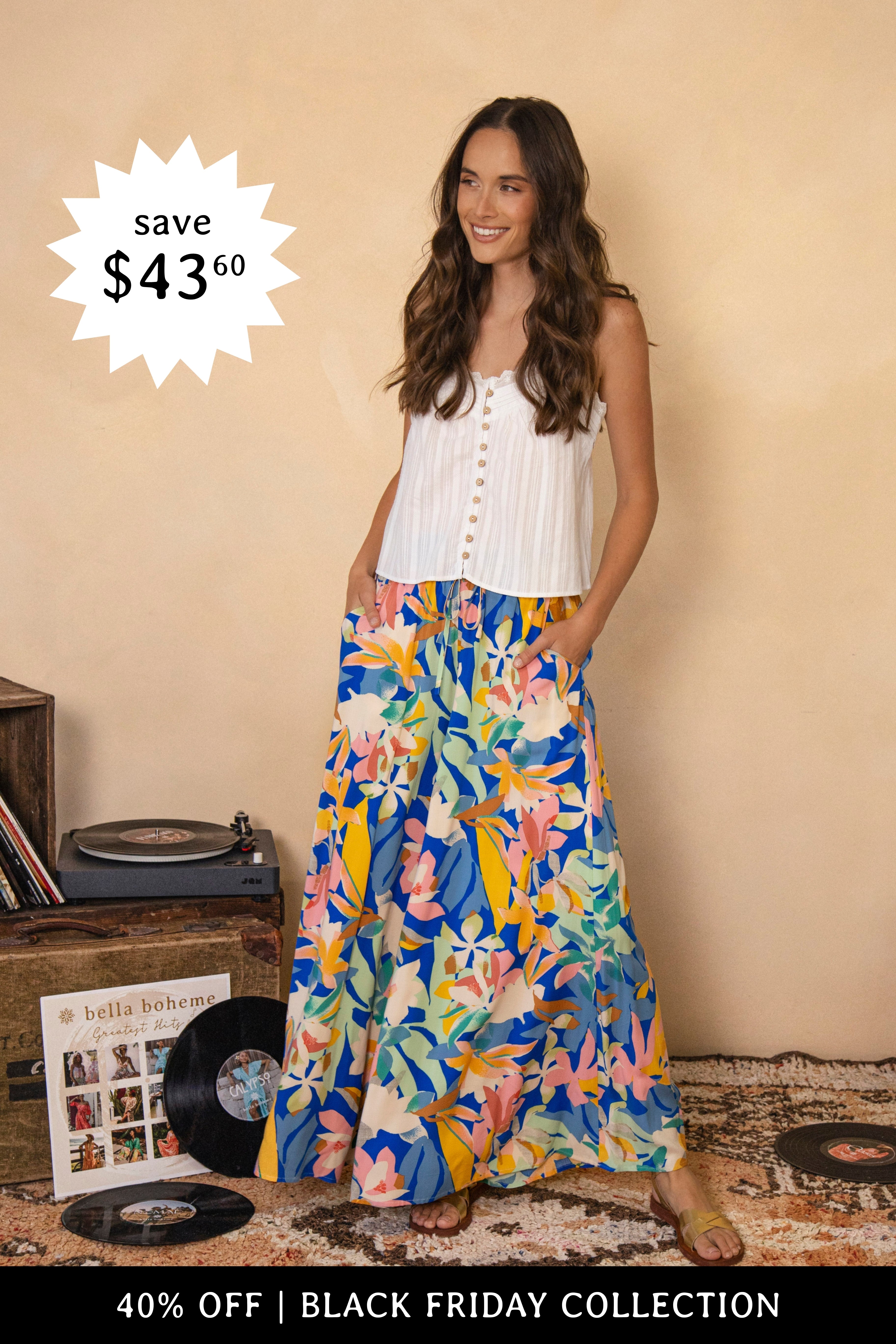 Camila Skirt  Poet Boho style skirt with floral pattern and contrast trim