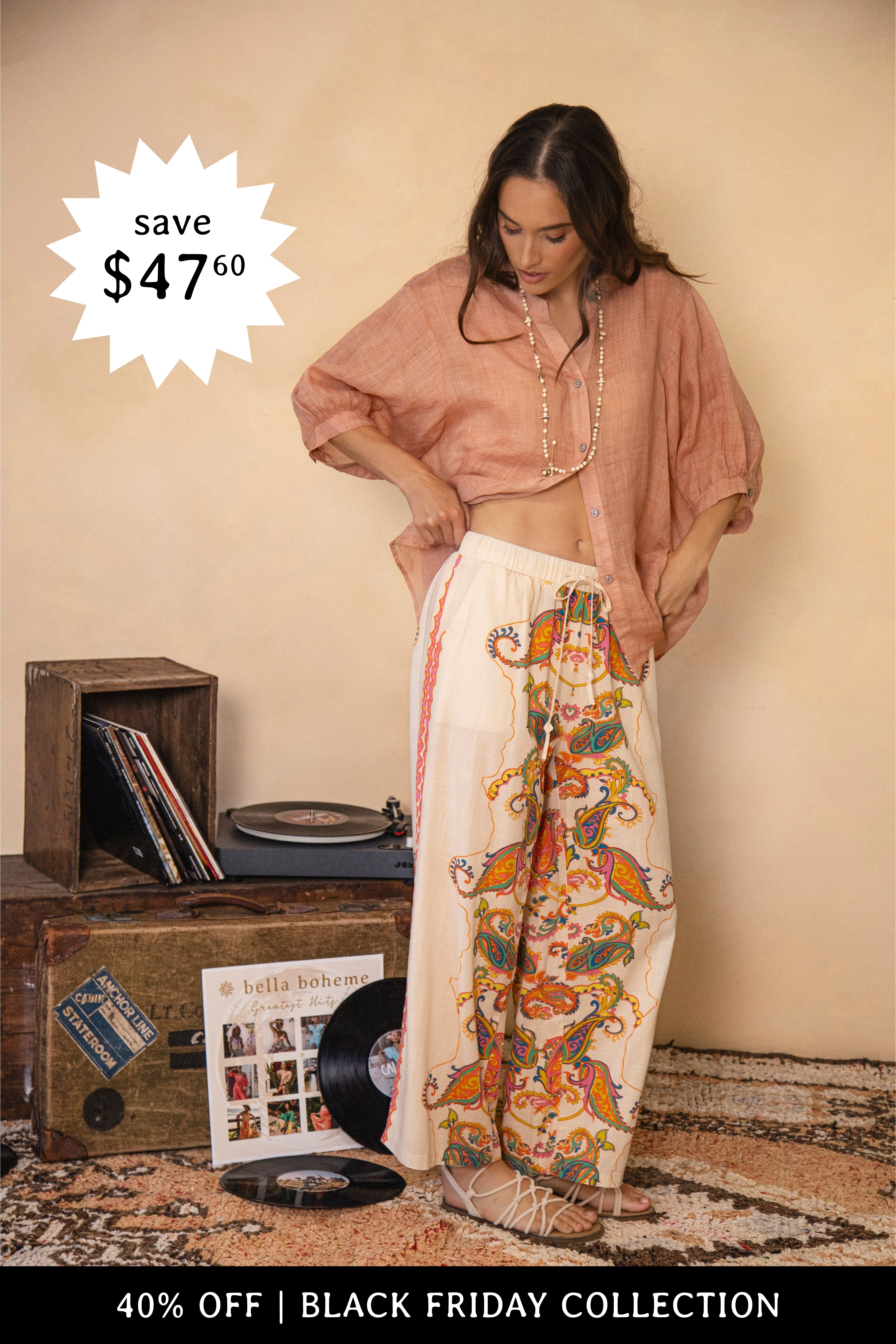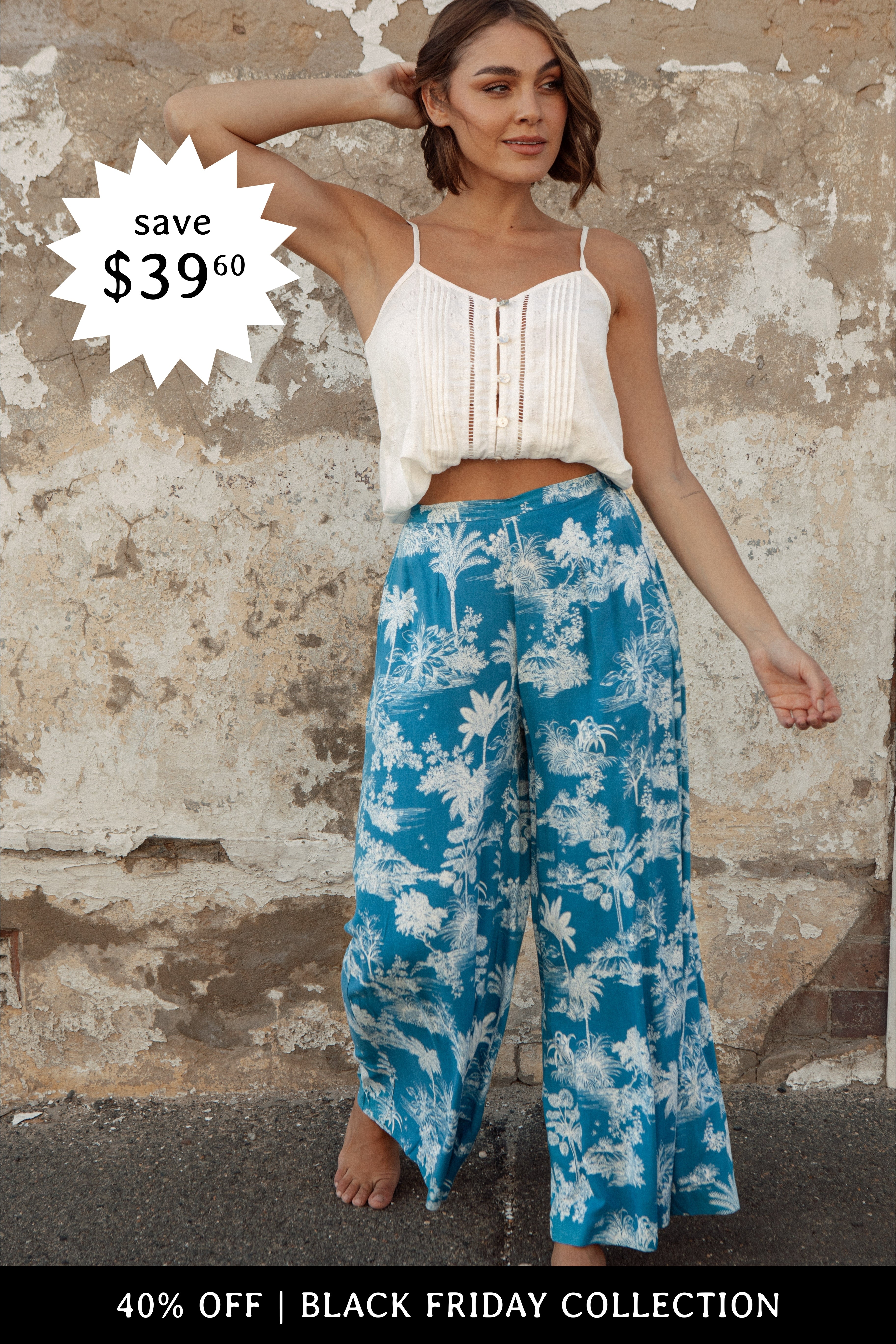 Aloha Vacay Pant featuring vibrant colourful pattern, drawstring waist and wide leg style