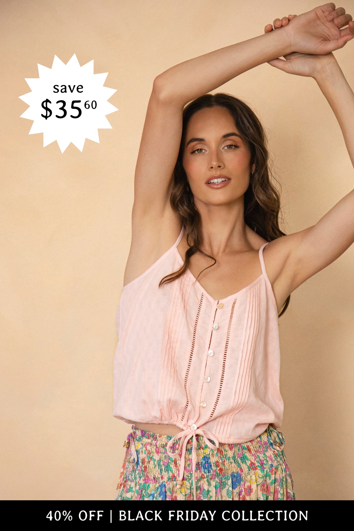 The Castaway Cami is a showstopper in the most beautiful shade of pink ready to pair with all your Boho skirts.