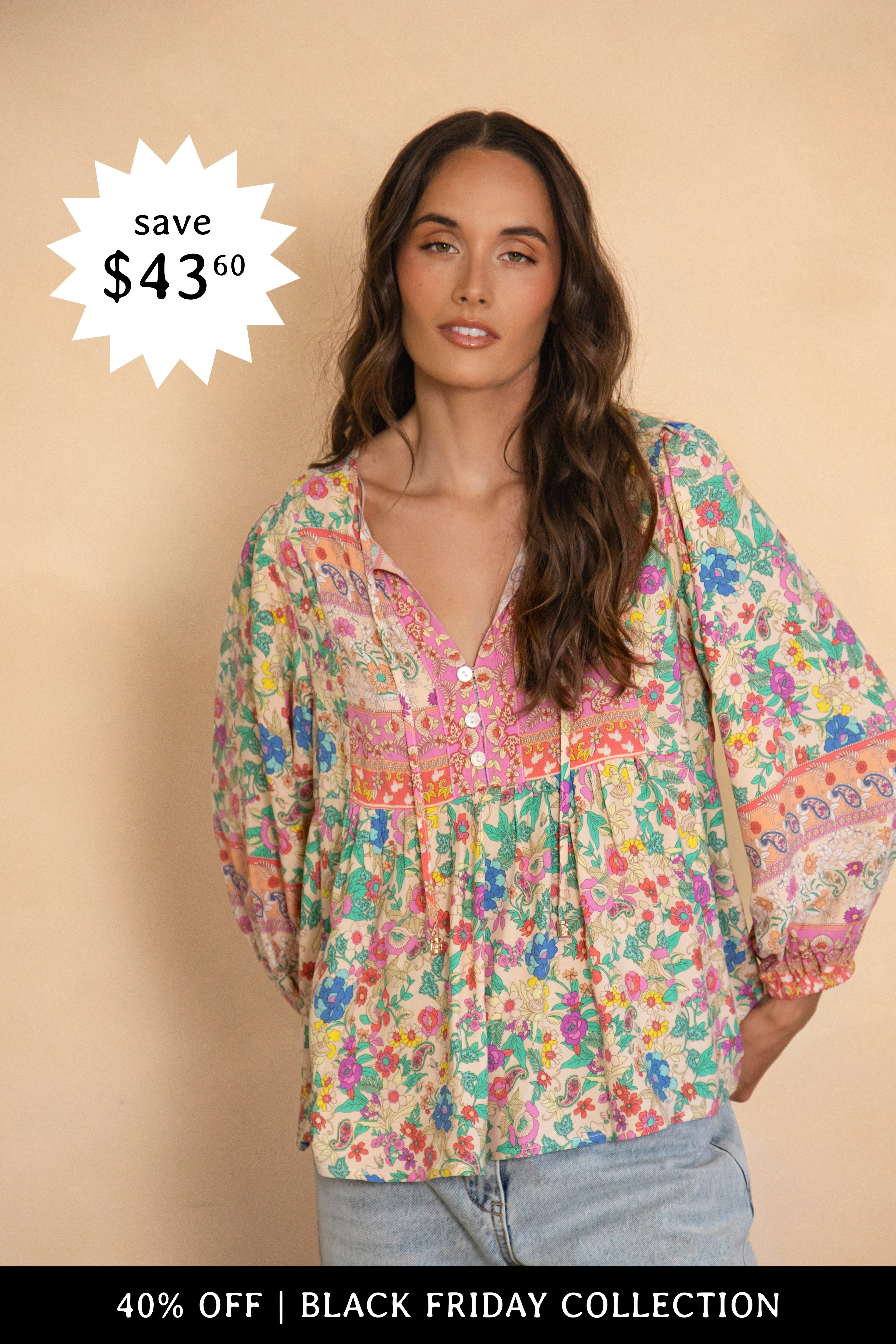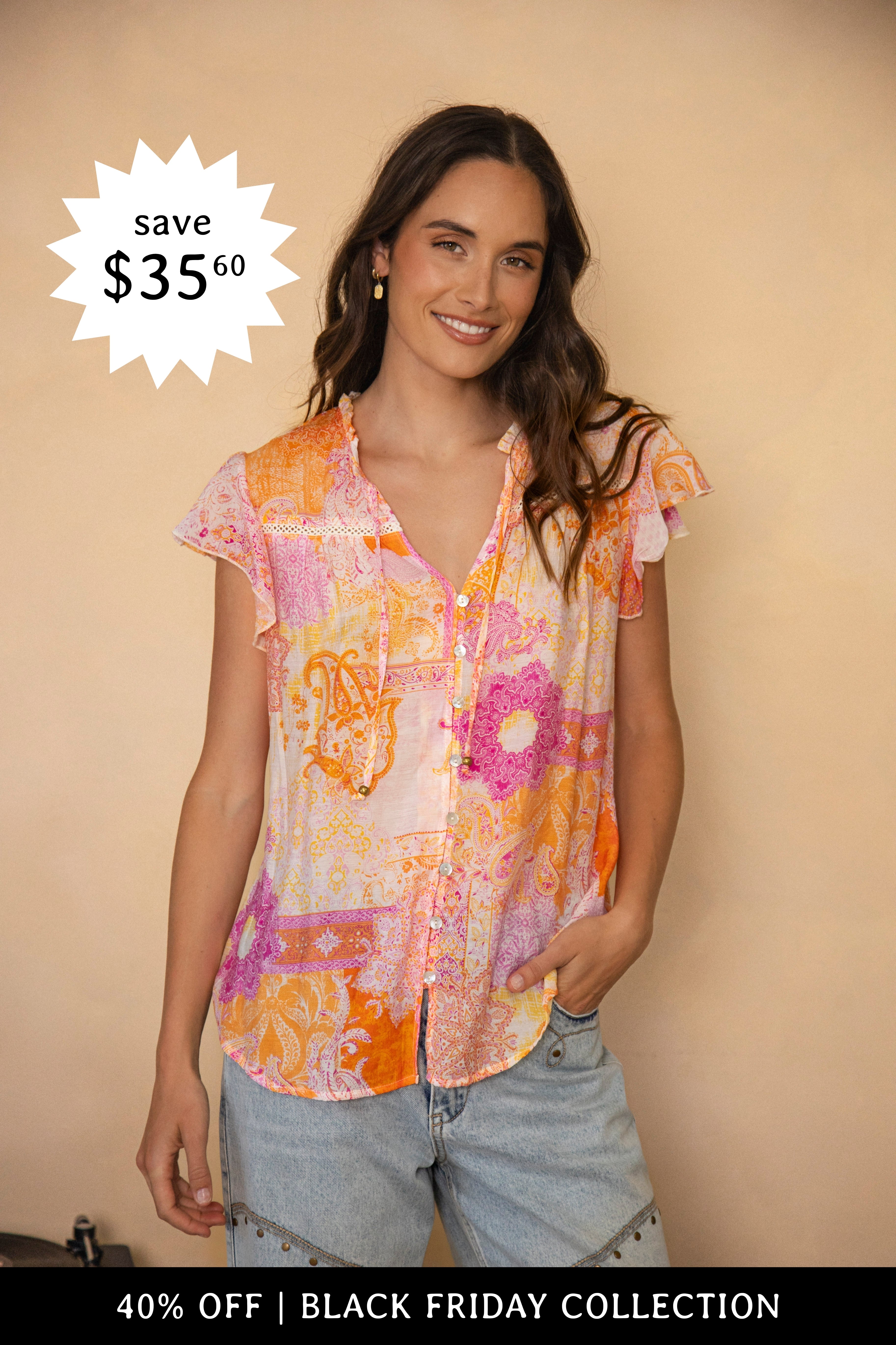 Blossom Blouse - Papaya short sleeve blouse with Boho inspired pattern in shades of pink orange and yellow