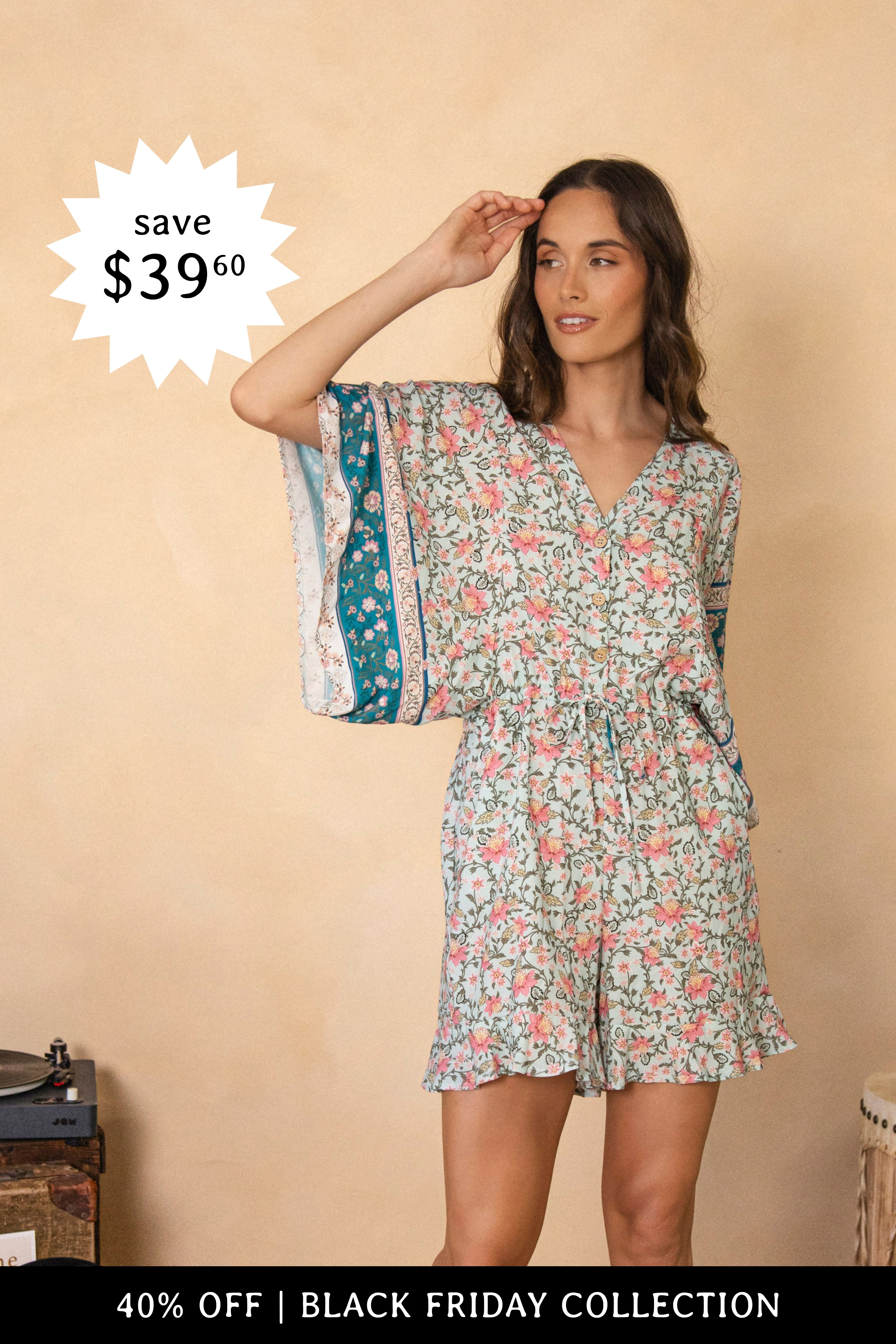 Vida Playsuit featuring floral pattern and wide sleeves with contrasting trim