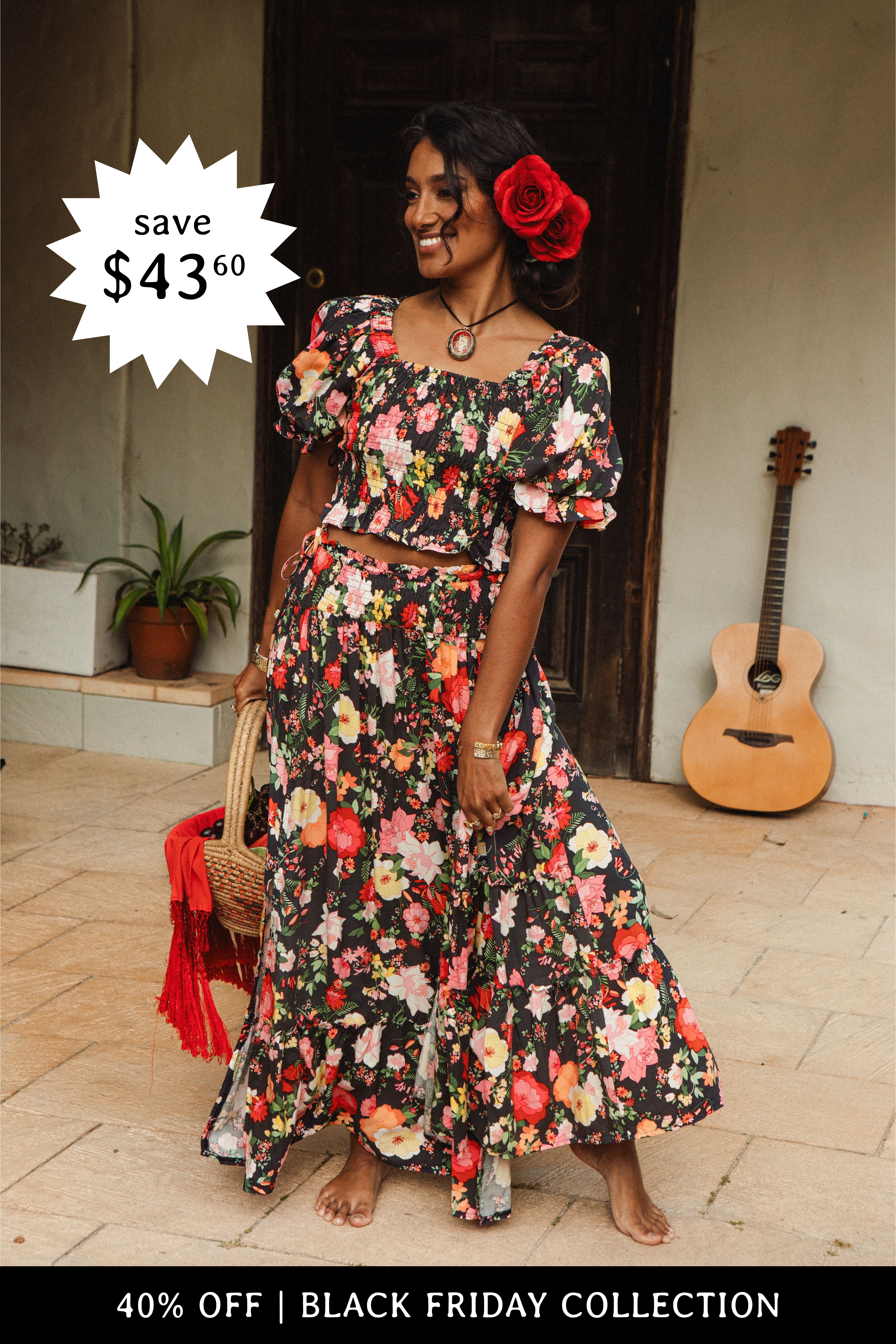 Camila Skirt Flamenco featuring vibrant floral pattern on black colourway