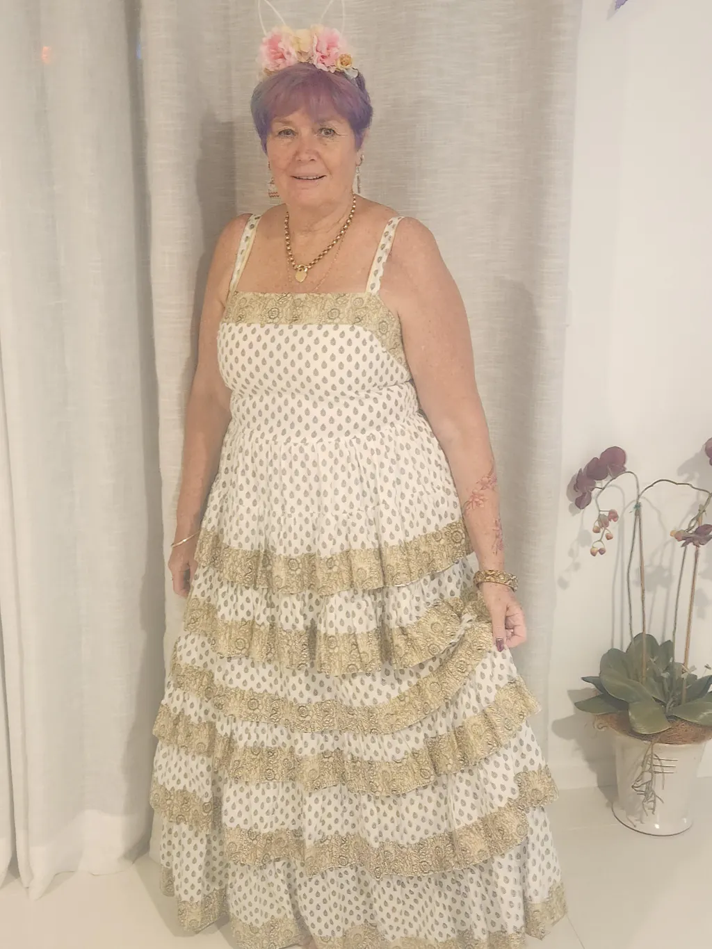 A floaty, beach-ready maxi dress in soft cream and warm brown tones with gorgeous ruffle detail. Effortless and coastal, made for sun, sand, and slow summer days, with a tiered silhouette that moves beautifully with every step.