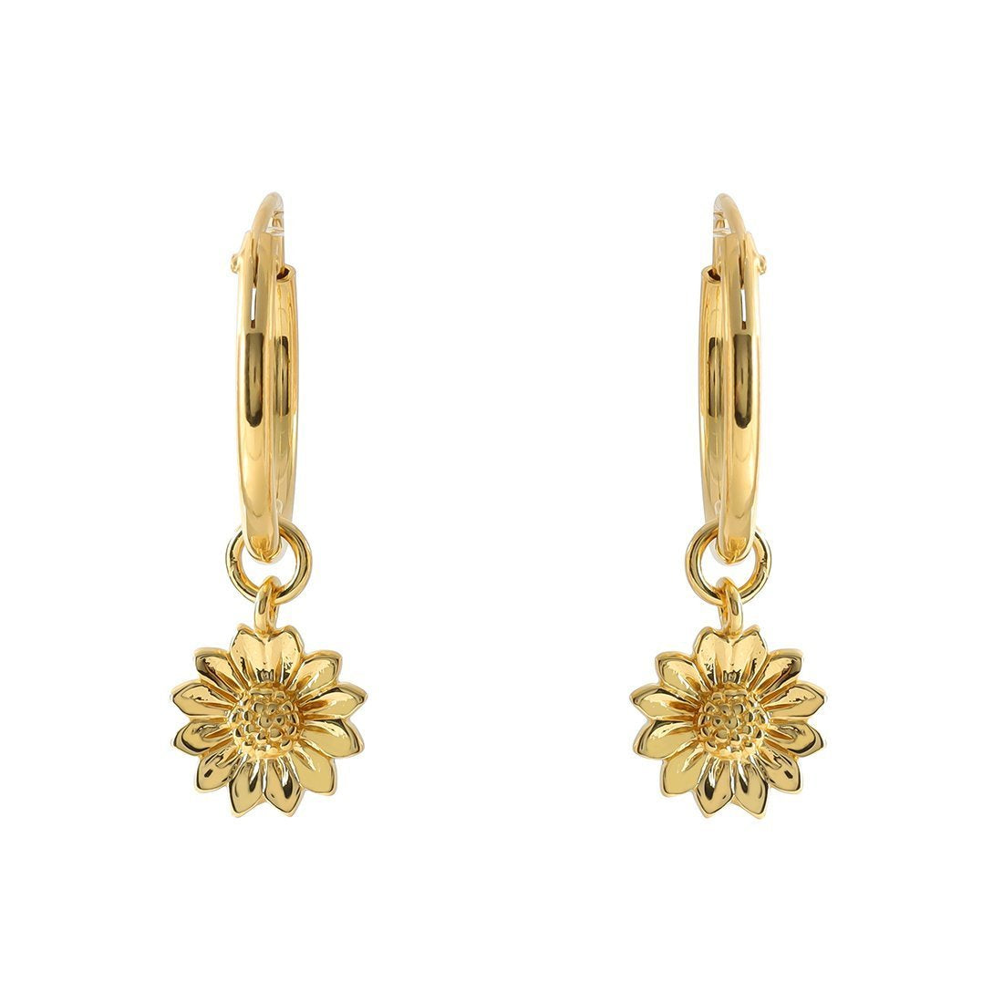 The Delicate Sunflower Sleepers Gold Vermeil Earrings are a radiant blend of elegance and craftsmanship. Each earring features a 7mm sunflower charm, gracefully suspended from a 14mm sleeper hoop, capturing the essence of nature's beauty.