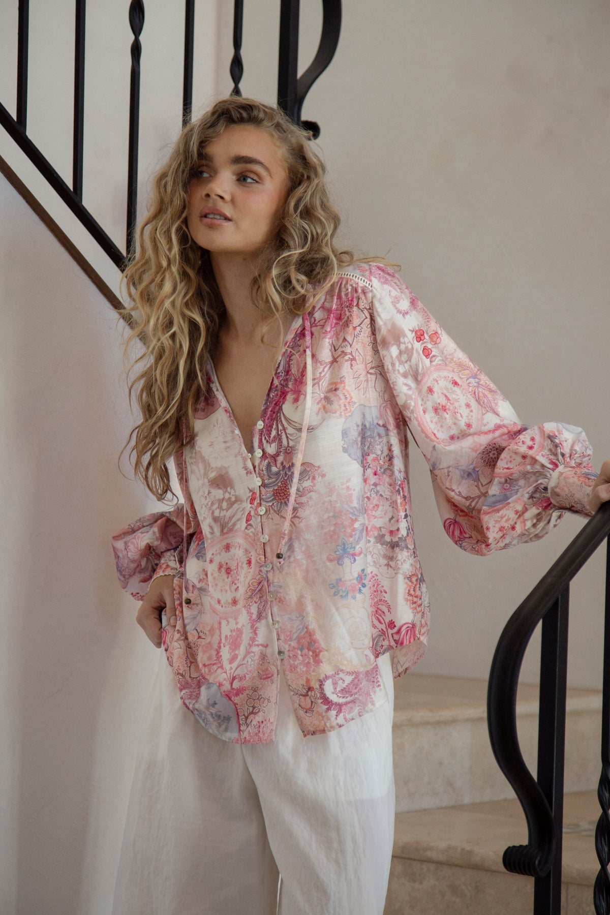 Daphne Blouse Posie featuring long billowy sleeves, button down style and delicate floral pattern in shades of pink
