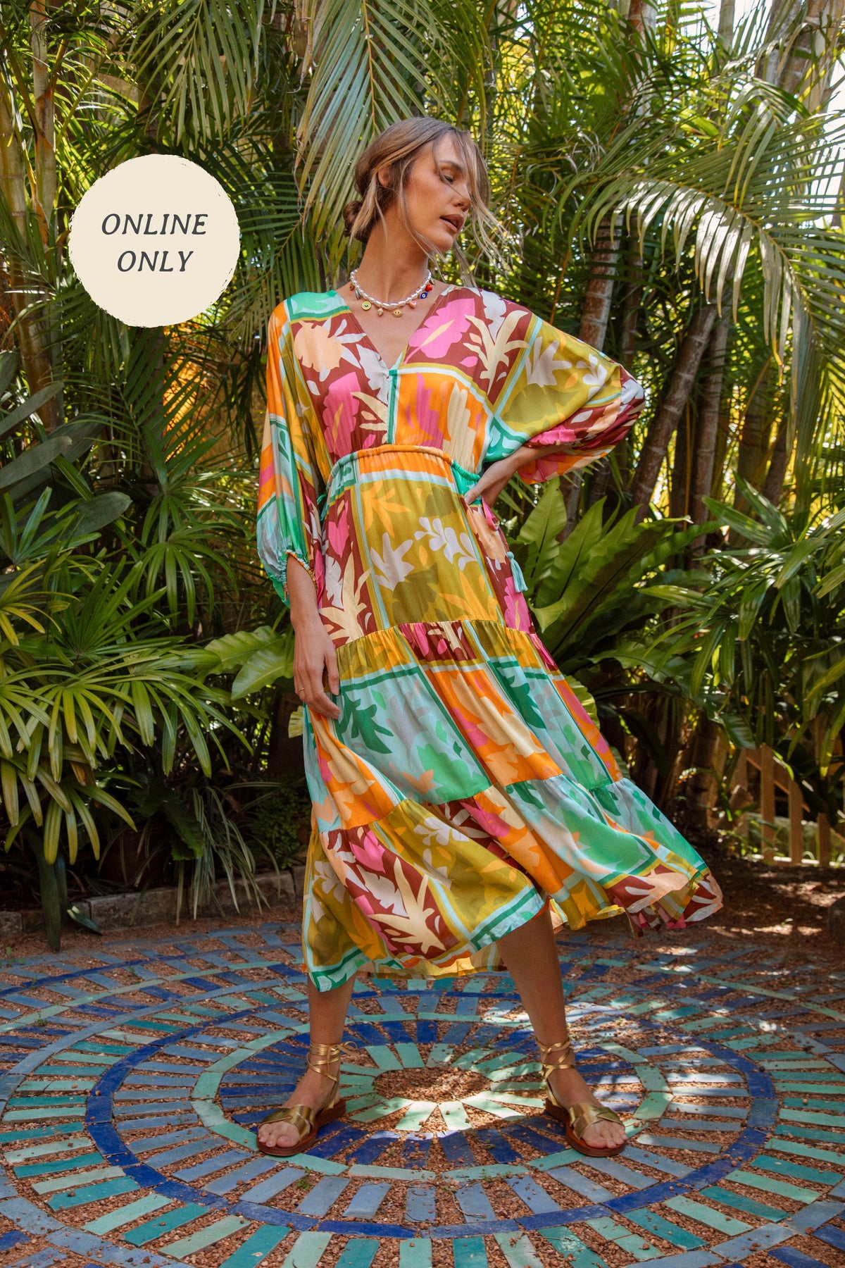 A tropical paradise in this dress! This striking print mixed with all the special details makes our Tropicana Dress a keepsake in your wardrobe!