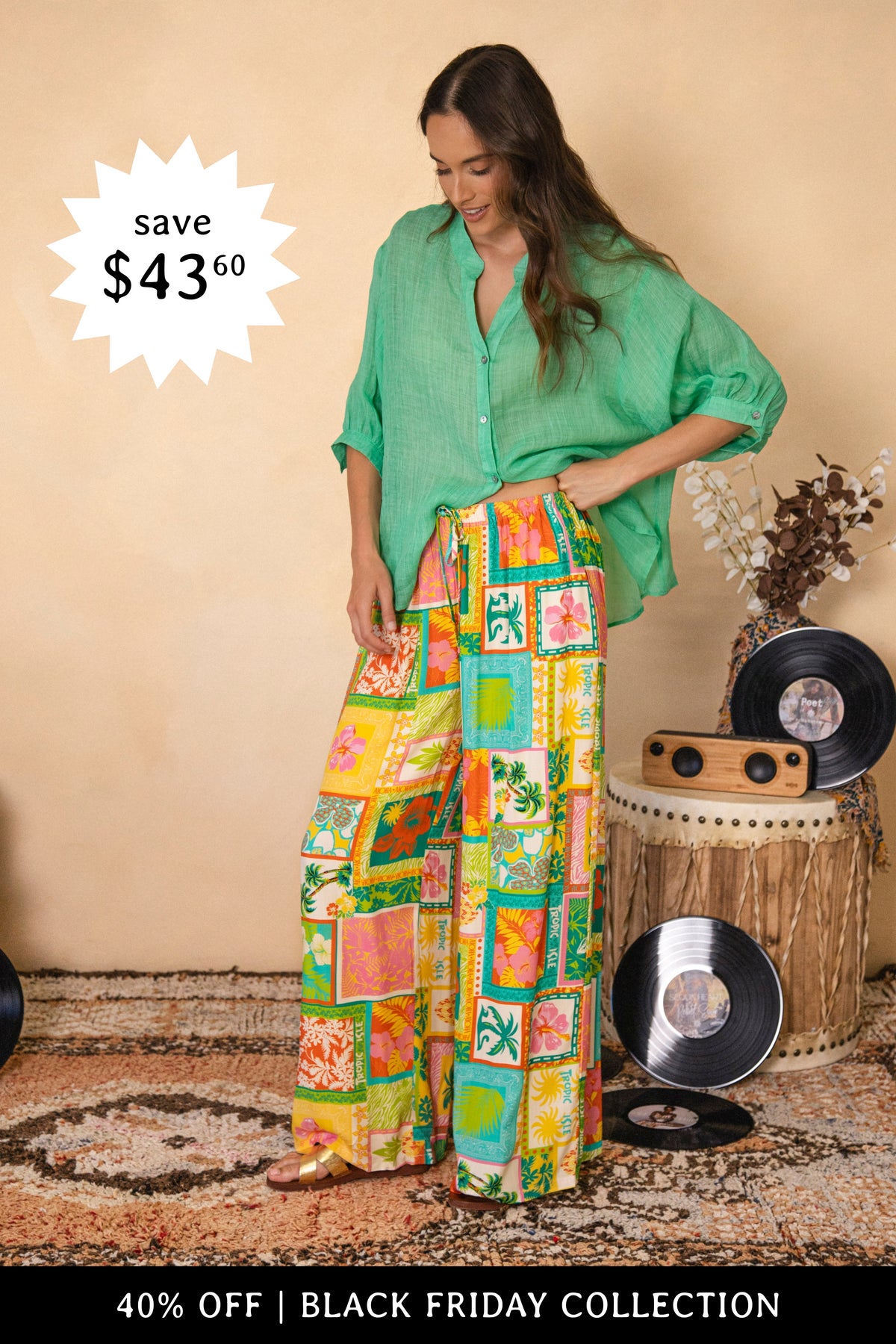 Our Aloha Vacay Pants are bright, bold and perfect for a Summer Getaway.