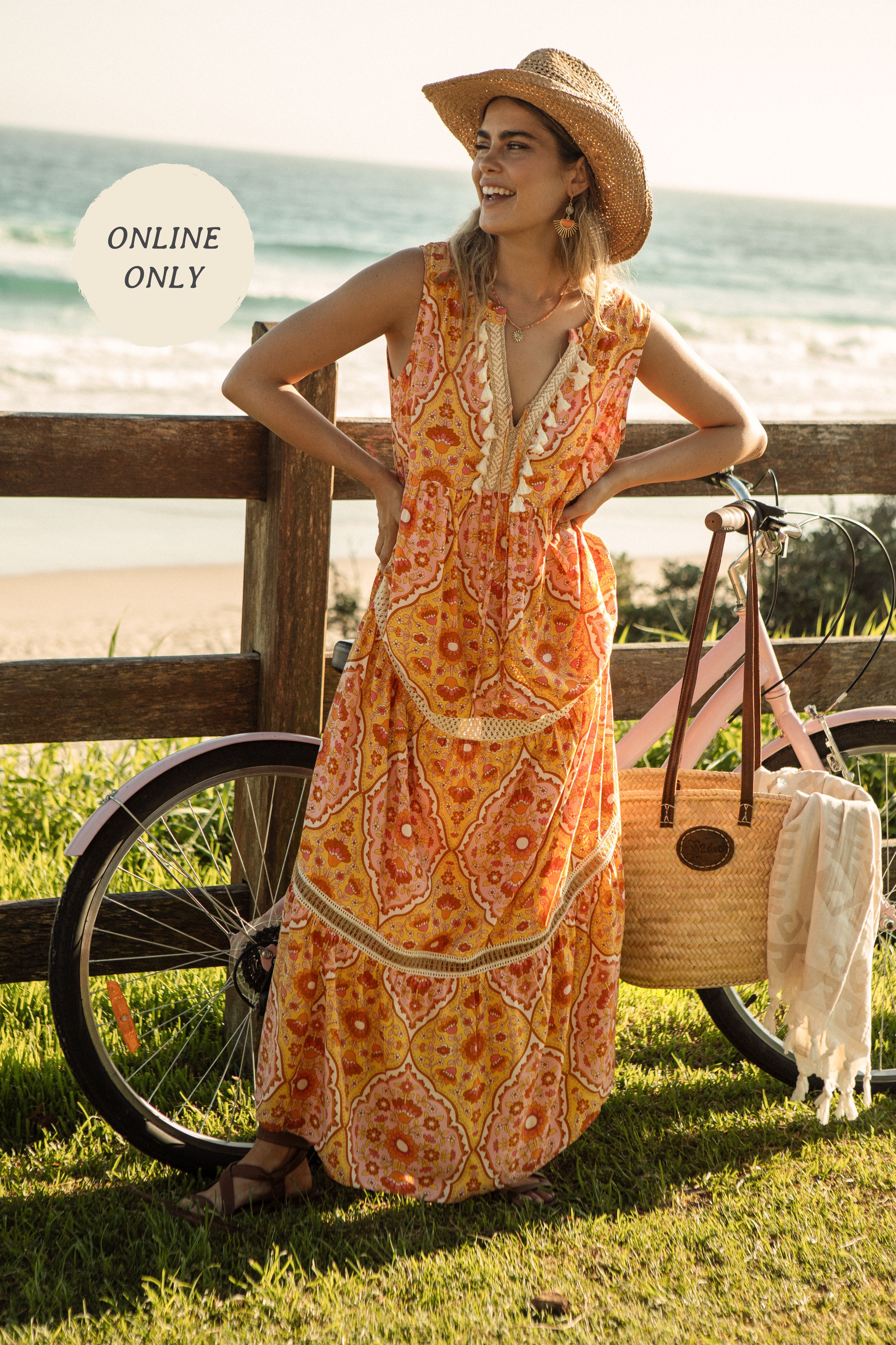 Nina Maxi Dress Golden Glow featuring sleeveless style, lace detail and tassel embellishments