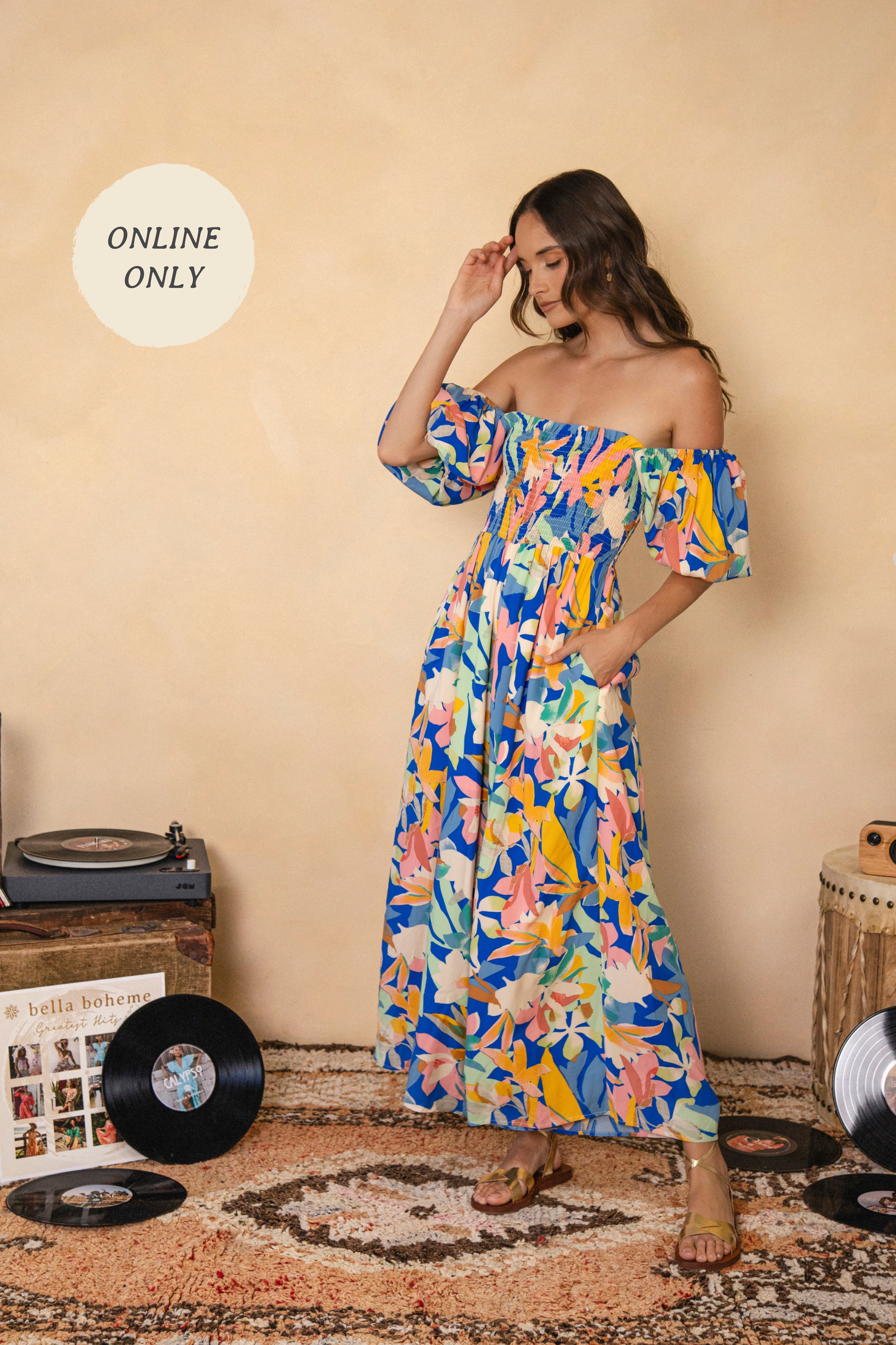 Samara Maxi Dress Pina Colada featuring shirred bodice and off the shoulder style