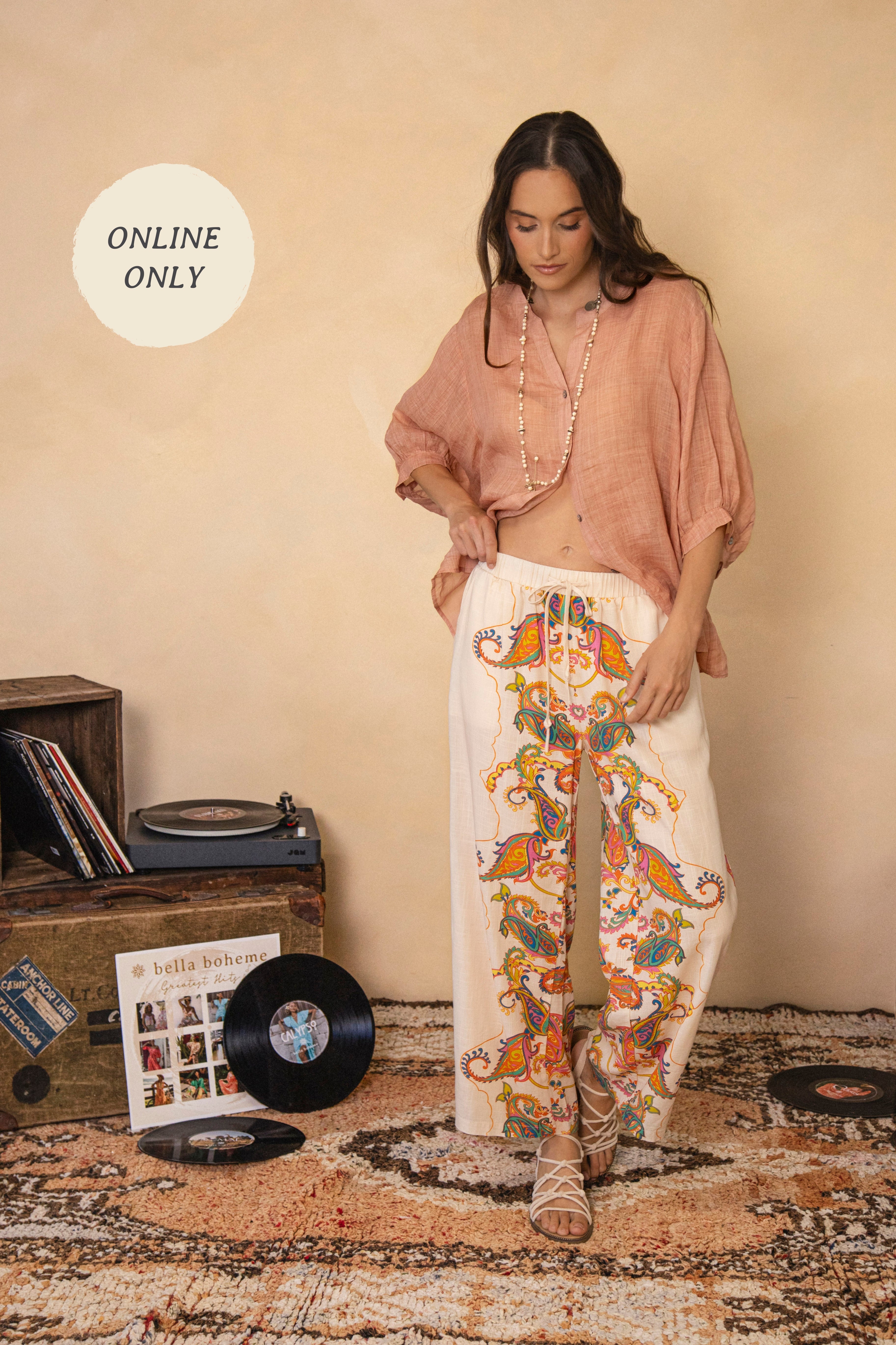 Summer Linen Pant Hibiscus featuring drawstring waist and wide leg style