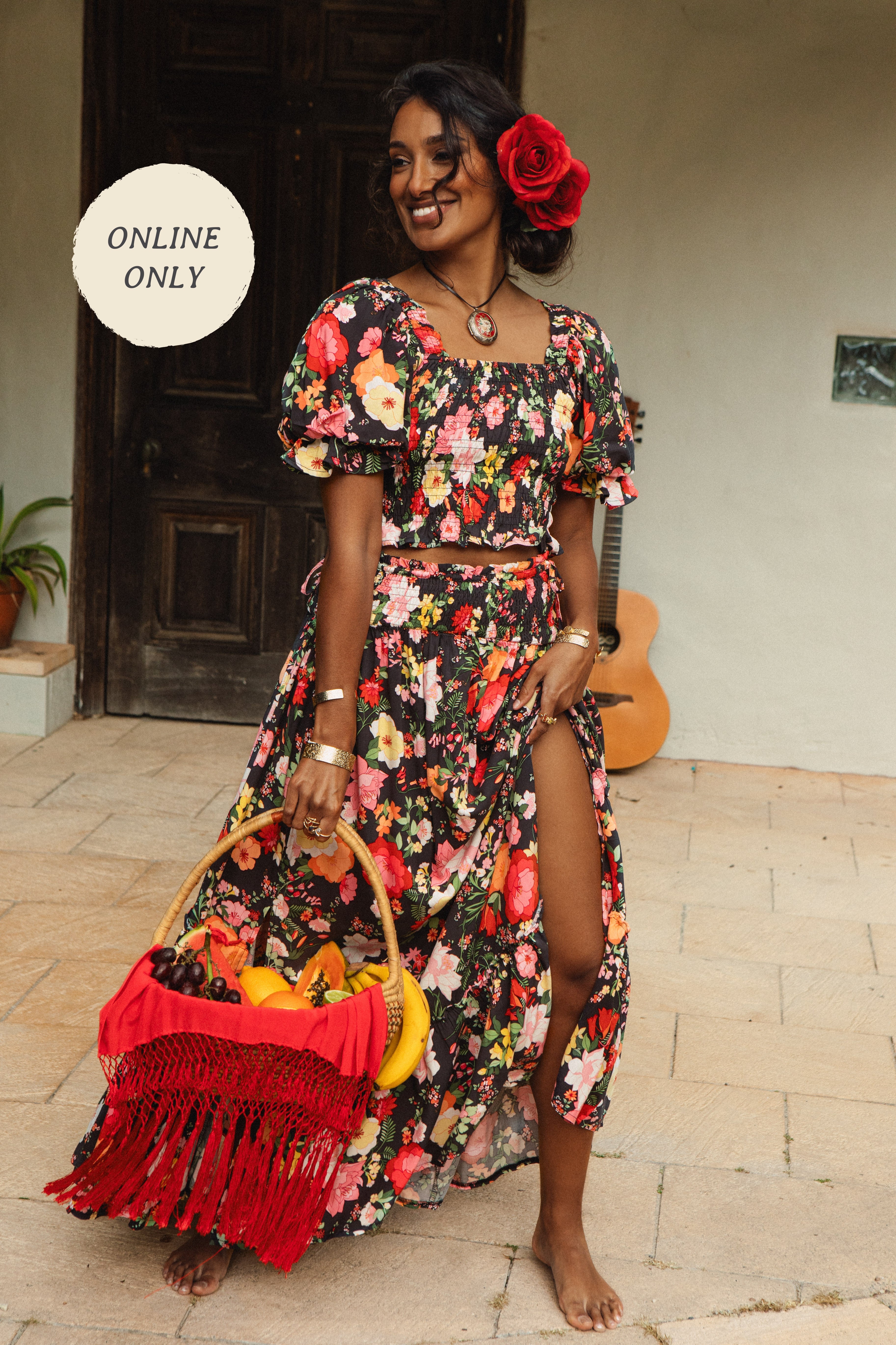 Camila Skirt Flamenco featuring vibrant floral pattern on black colourway