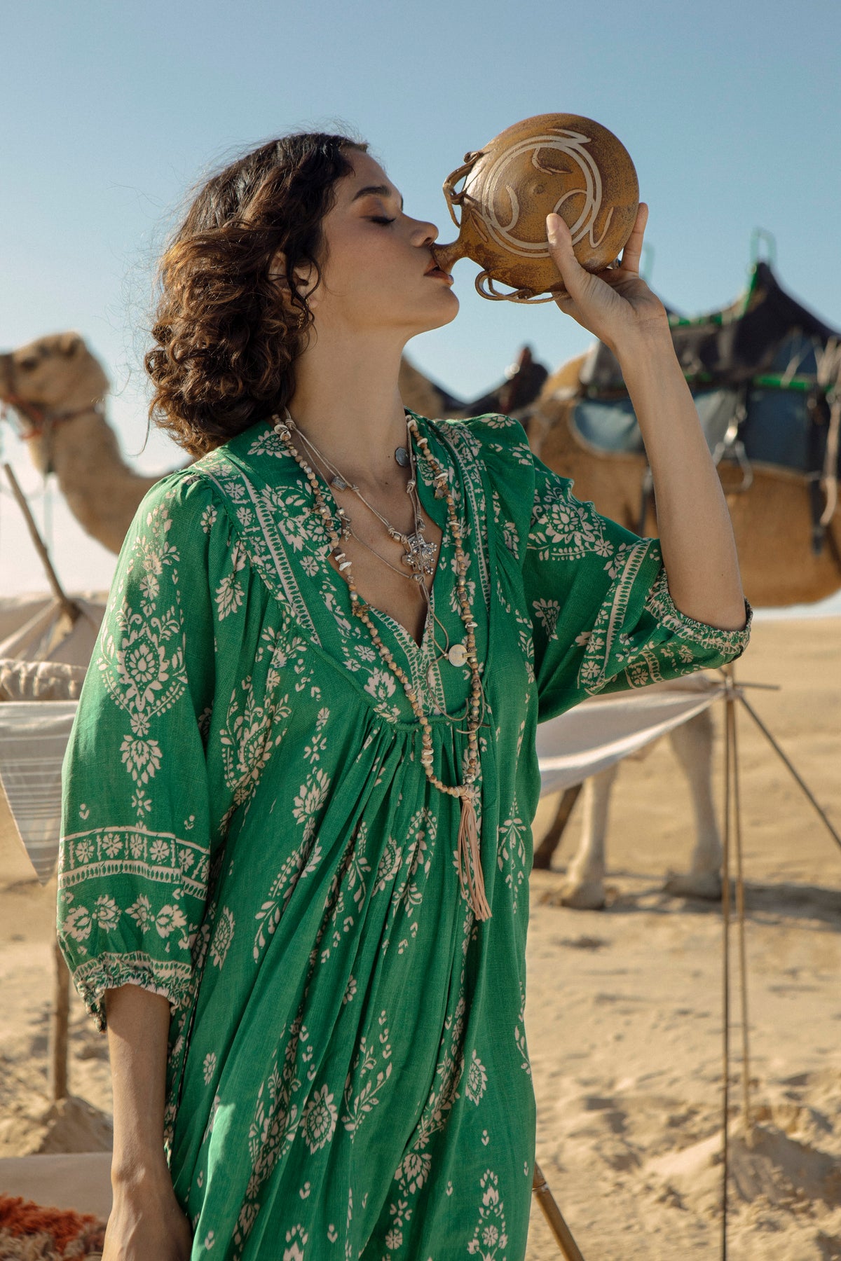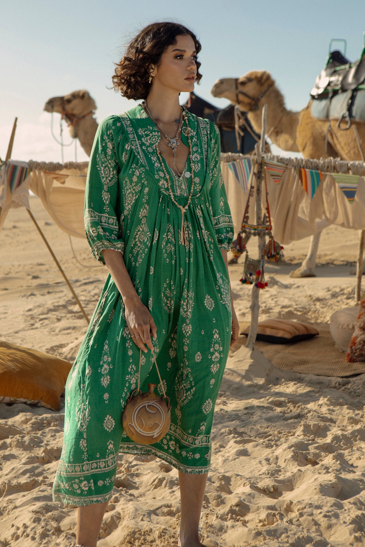 Rue Midi Dress Kiva - Boho style midi dress in green colourway with contrasting beige pattern