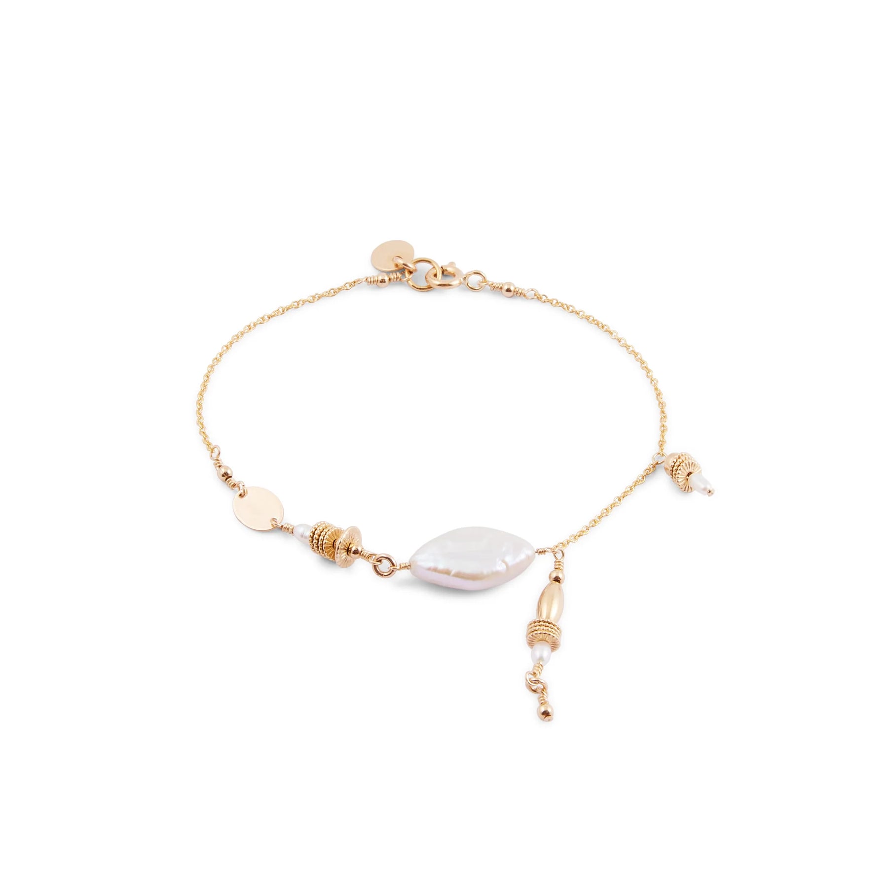 This distinctive design features a large freshwater pearl centrepiece surrounded by flattened textured discs, beads and mini pearls. Perfect for beach-lovers and can be worn as a statement bracelet or stacked for an eye-catching look.