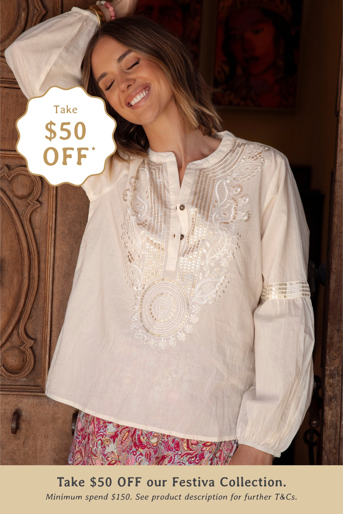 *TAKE $50 OFF OUR FESTIVA COLLECTION. Simply add your Festiva favourites to cart. Once you reach the minimum spend threshold of $150, your $50 discount will automatically apply. Please note the minimum spend threshold must comprise of clothing products from our Festiva Collection only. Any products (that are not within the Festiva collection) won't count toward the minimum threshold. Offer ends 11:59pm AEDT 26th Jan.