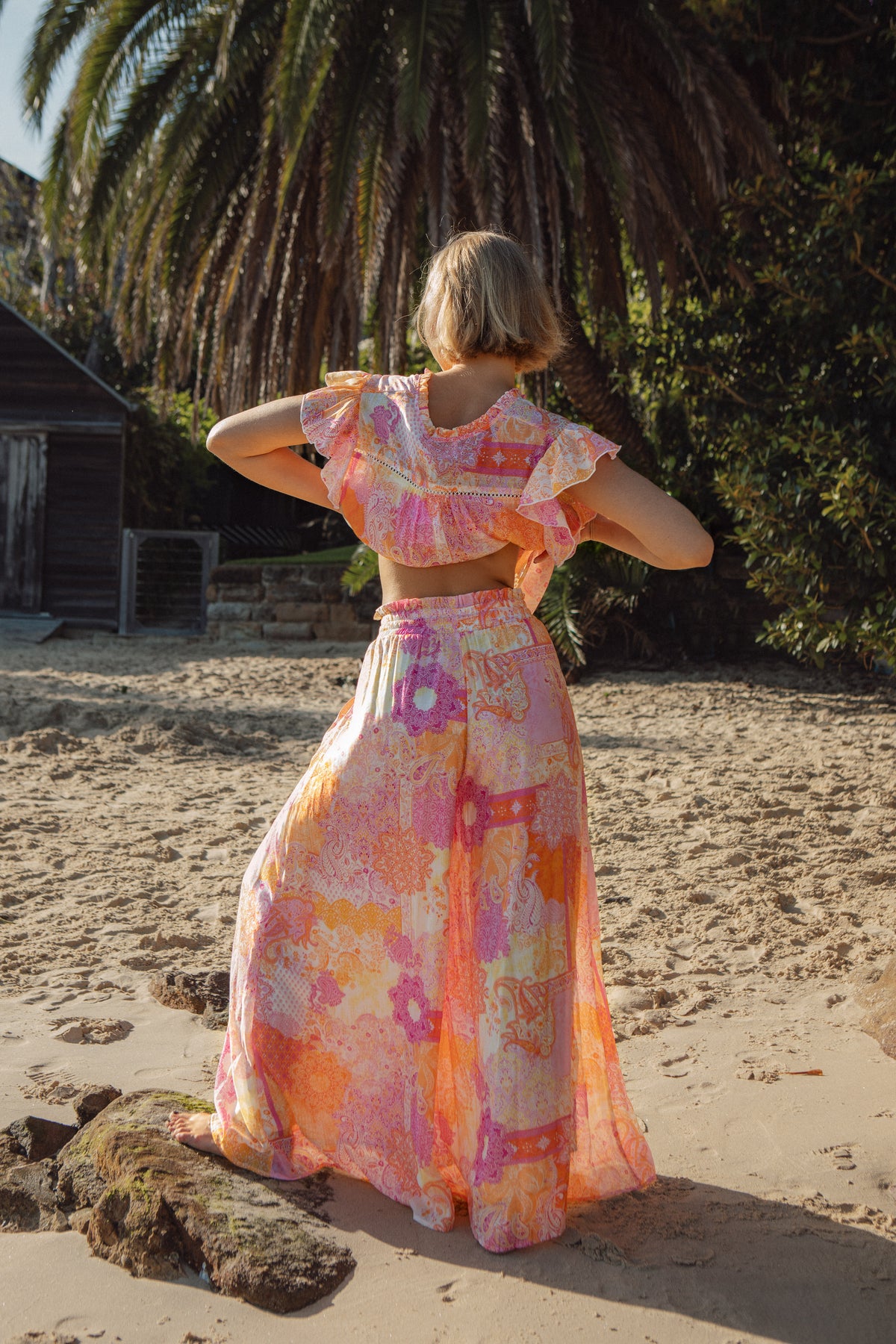 Resort Pant Papayafeaturing Boho inspired print in vibrant shades of pink, orange and yellow