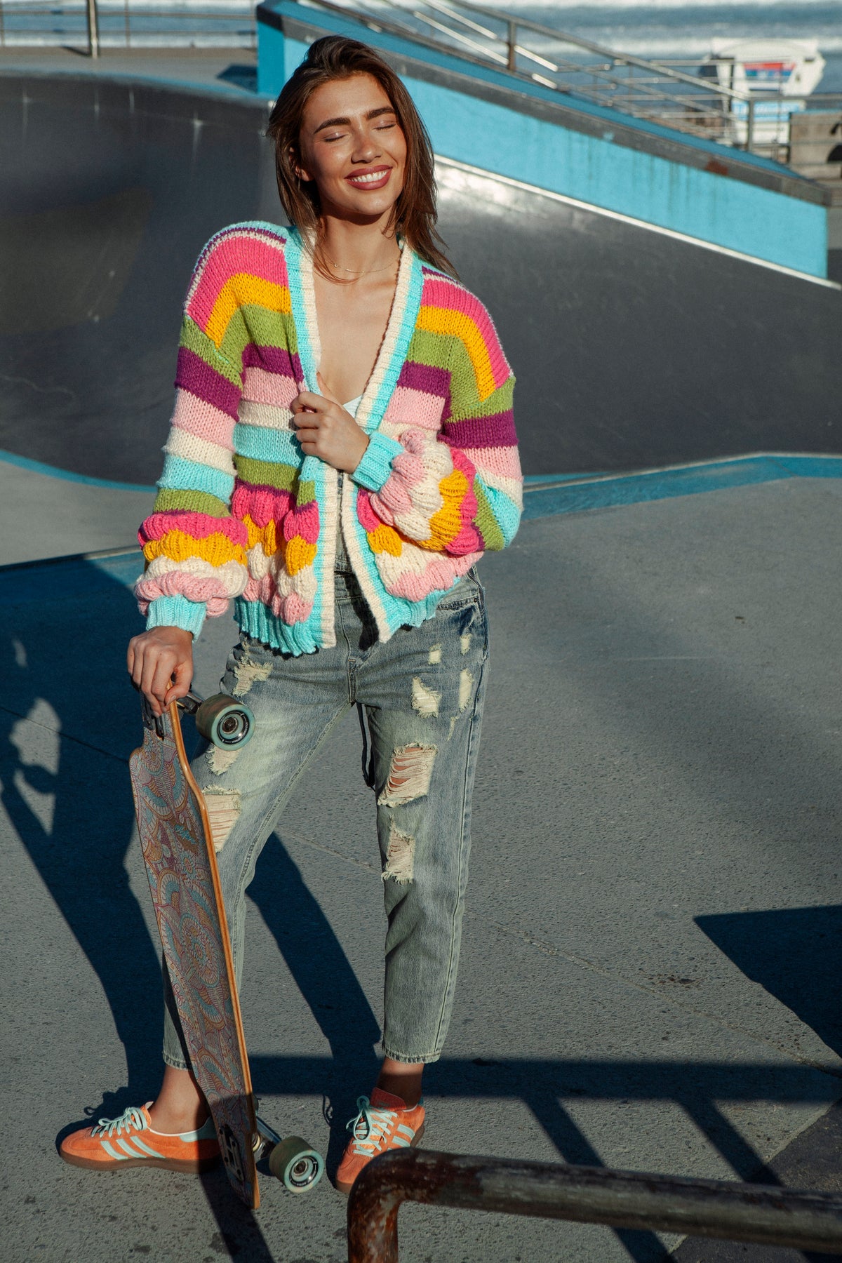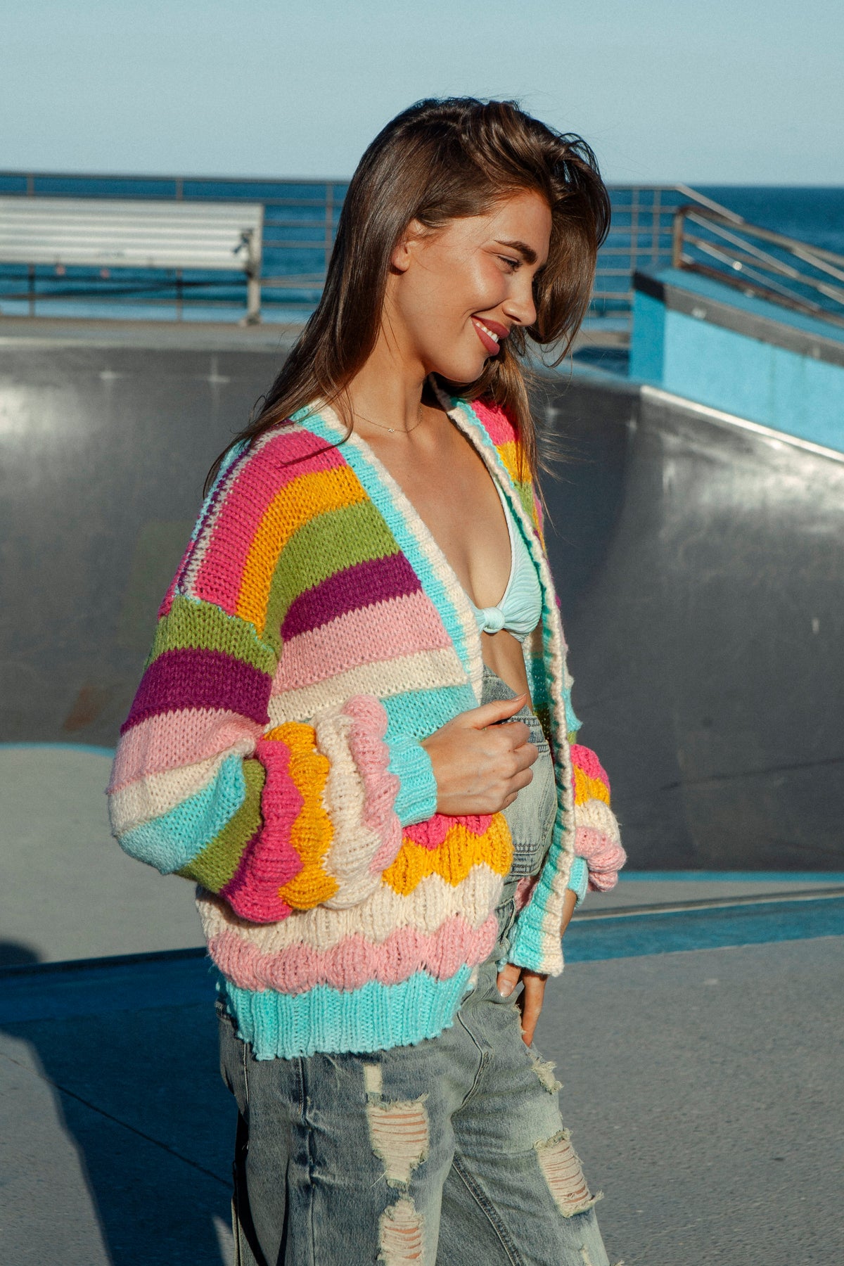 Bring a pop of colour and brighten up your new season wardrobe with our Retro Rainbow Stripe Cardigan. This chunky cable knit cardigan is a slouchy and relaxed fit making it oh so easy to layer over a basic tee and your favourite denim bottoms.