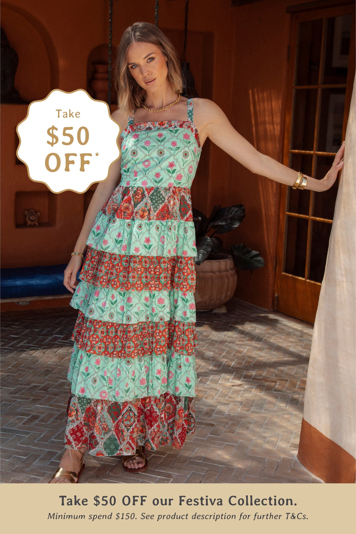 *TAKE $50 OFF OUR FESTIVA COLLECTION. Simply add your Festiva favourites to cart. Once you reach the minimum spend threshold of $150, your $50 discount will automatically apply. Please note the minimum spend threshold must comprise of clothing products from our Festiva Collection only. Any products (that are not within the Festiva collection) won't count toward the minimum threshold.  Offer ends 11:59pm AEDT 26th Jan.