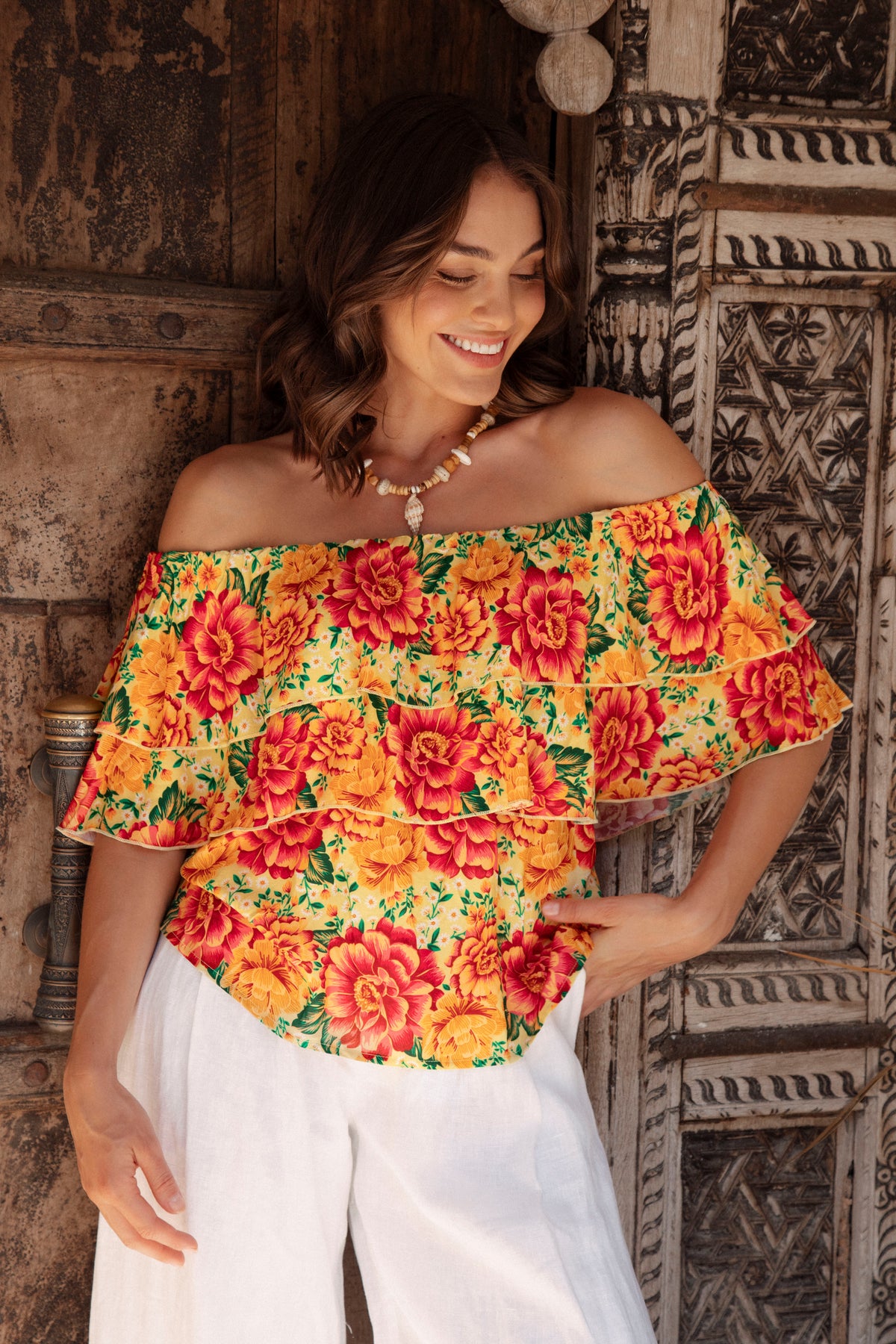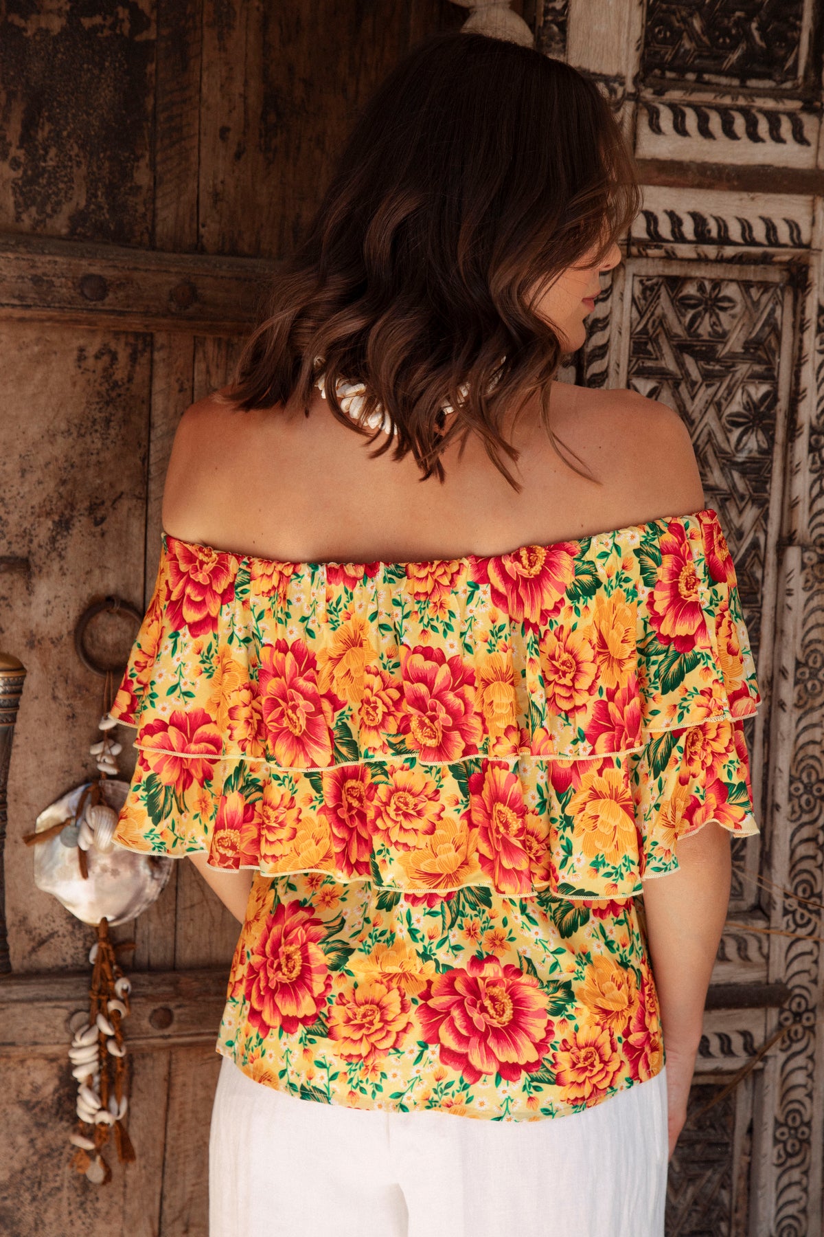 The Zoe Top is a flirty and feminine favourite! Designed to channel sun-drenched summer days, this off-the-shoulder beauty features voluminous double ruffle layers that dance with every move! Pair back with the matching Zoe Frill Skirt or with denim for an everyday vibe!